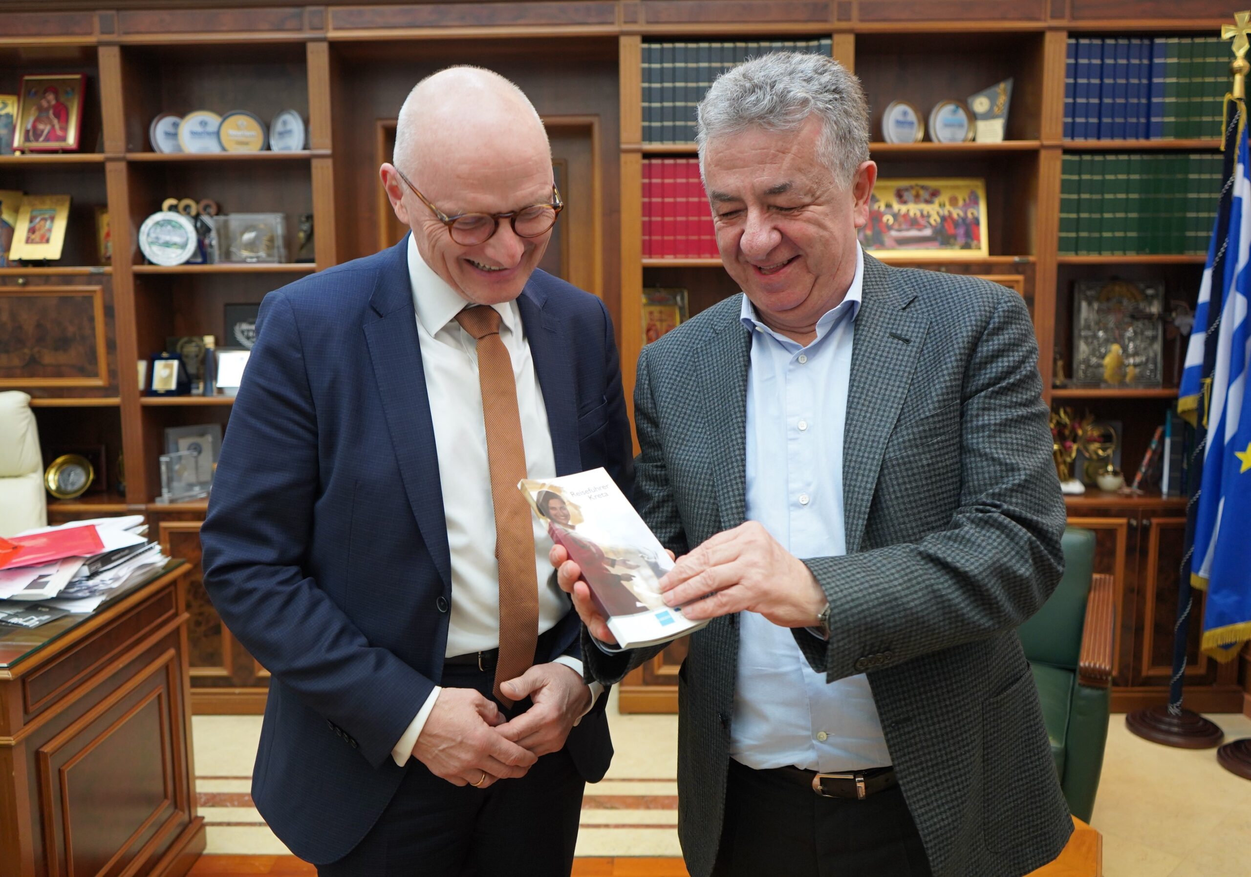 Ο Πρέσβης της Ομοσπονδιακής Δημοκρατίας της Γερμανίας στην Ελλάδα Andreas Kindl επισκέφθηκε σήμερα τον Περιφερειάρχη Κρήτης Σταύρο Αρναουτάκη, συνοδευόμενος από το νέο Επίτιμο Πρόξενο της Γερμανίας στο Ηράκλειο Δρ. Γεώργιο Καλουτσάκη.