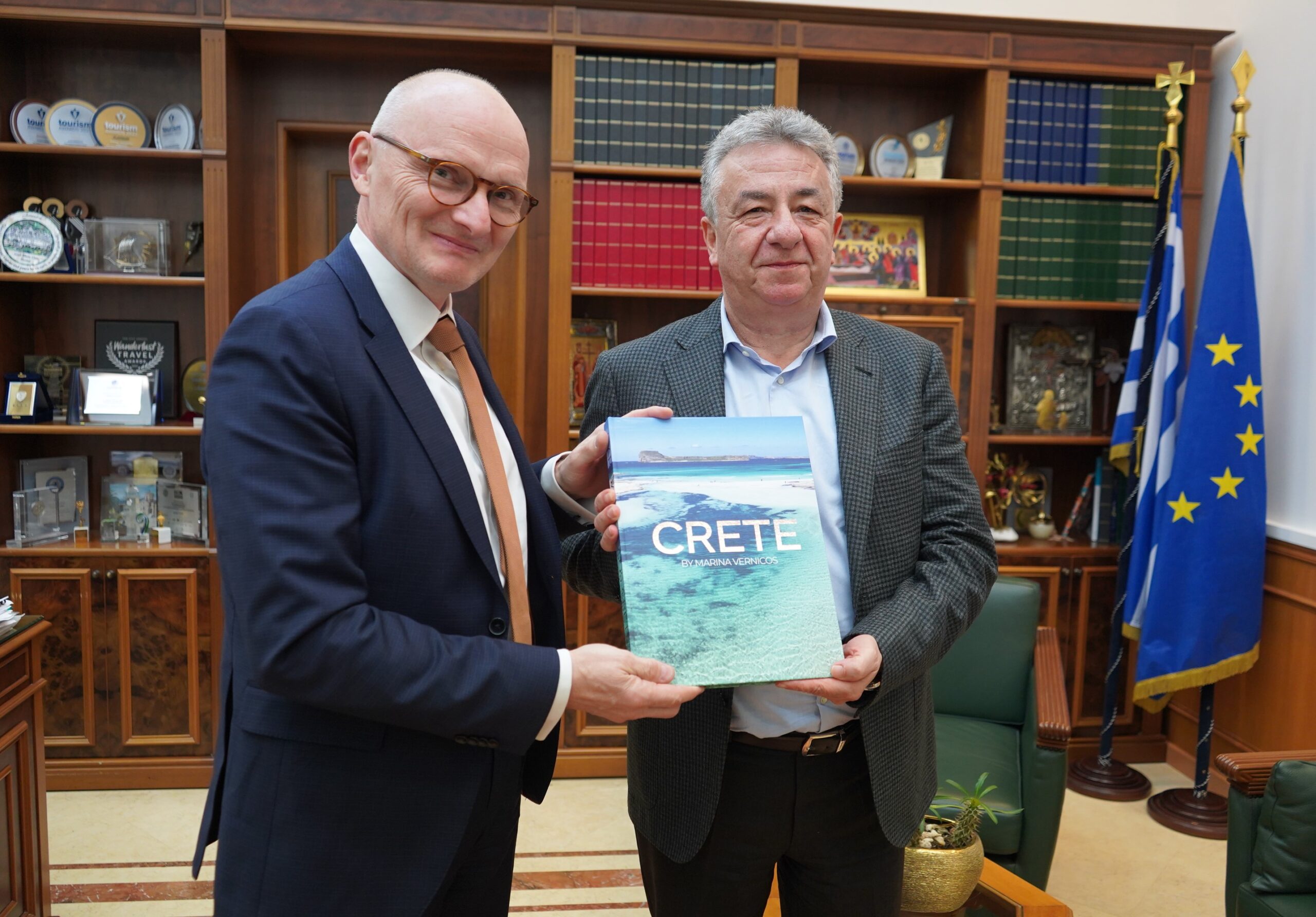 Ο Περιφερειάρχης Κρήτης αναφέρθηκε στα μεγάλα έργα που βρίσκονται σε εξέλιξη στο νησί όπως το νέο αεροδρόμιο και ο ΒΟΑΚ, τα οποία θ’ αναβαθμίσουν σημαντικά τις τουριστικές υποδομές και τις παροχές προς τους διαρκώς αυξανόμενους επισκέπτες του νησιού. Υπογράμμισε την καλή συνεργασία και τις διαχρονικές φιλικές και επιχειρηματικές σχέσεις που έχουν διαμορφωθεί ανάμεσα στην Κρήτη και τη Γερμανία. Συνεχάρη τον Πρέσβη για την επιλογή του νέου Προξένου, επισημαίνοντας πως έχει όλα τα εχέγγυα για να διανύσει μια επιτυχημένη πορεία και να βοηθήσει περαιτέρω στην ανάπτυξη και εμβάθυνση των σχέσεων της Γερμανίας με την Κρήτη.