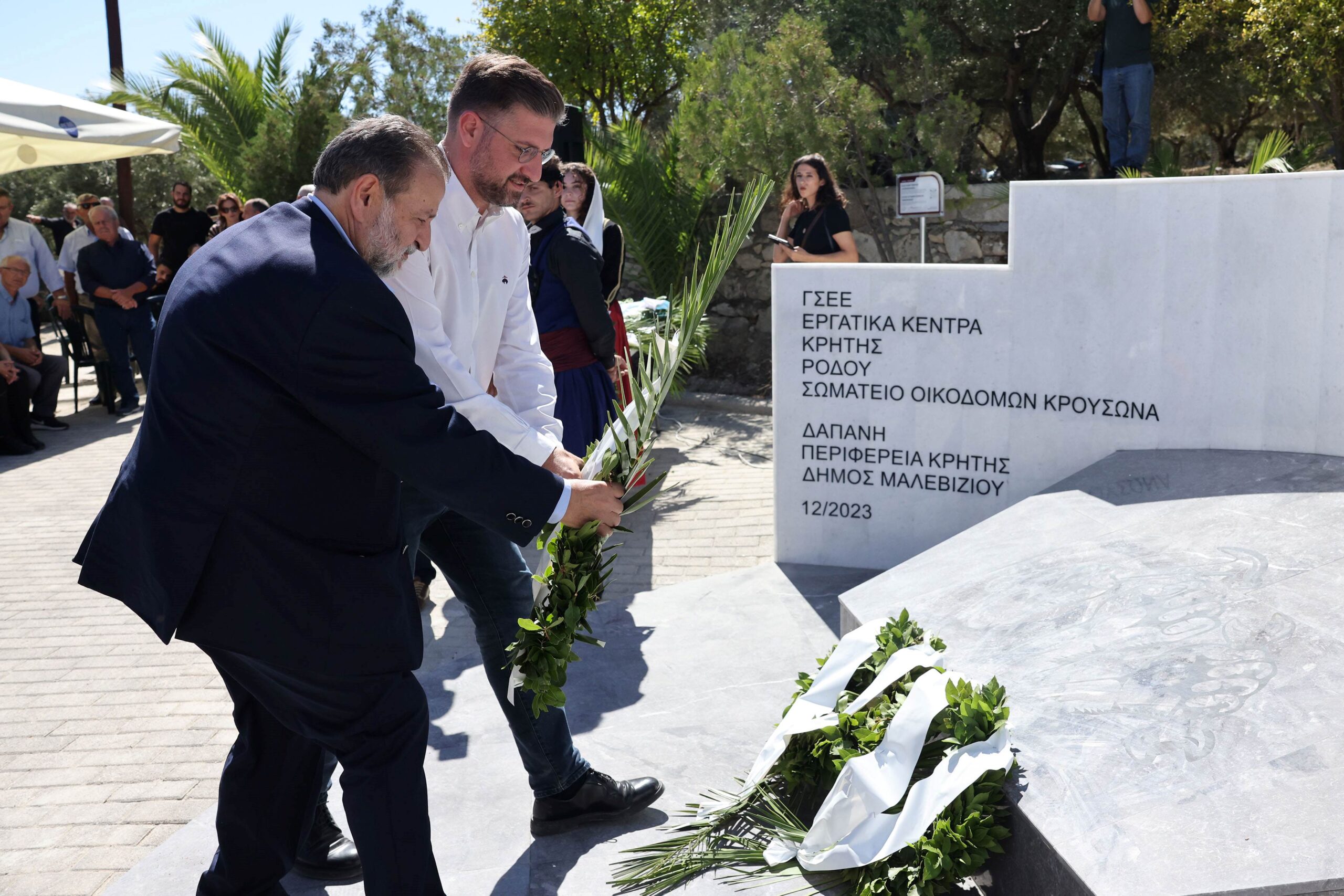 Μία πρόταση από το Σύλλογο Οικοδόμων Κρουσώνα, τα Εργατικά Κέντρα της Κρήτης και Ρόδου, που αγκάλιασε ο Δήμος Μαλεβιζίου από την πρώτη στιγμή και η Περιφέρεια Κρήτης έγινε πράξη με τα αποκαλυπτήρια του Μνημείου Θυμάτων Εργατικών Δυστυχημάτων.