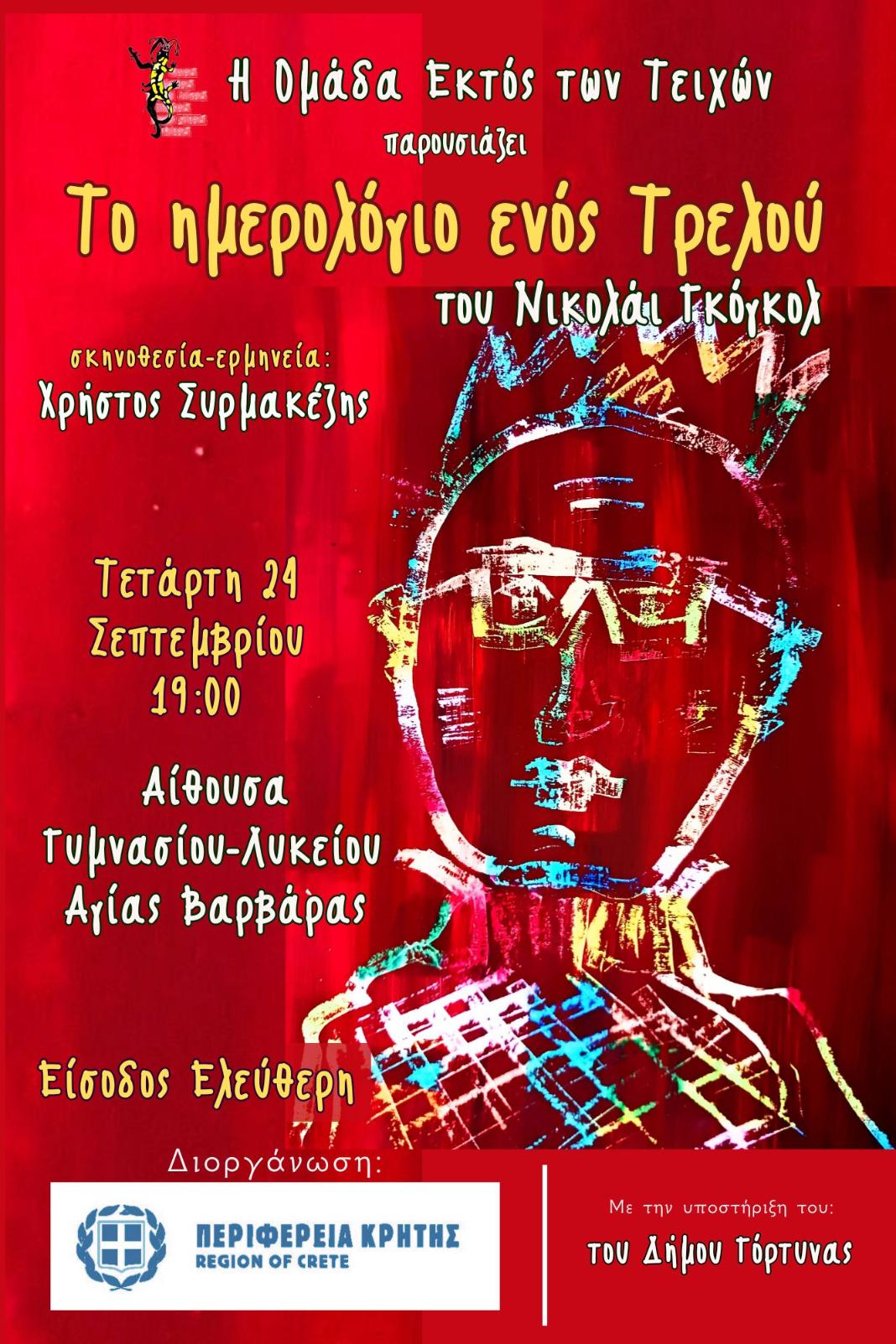 Τετάρτη, 24 Σεπτέμβρη, 7:00μ.μ., θεατρική παράσταση «το Ημερολόγιο ενός Τρελού» με τον Χρήστο Συρμακέζη. Αίθουσα εκδηλώσεων Γυμνασίου-Λυκείου Αγίας Βαρβάρας, Δημοτική Ενότητα Αγίας Βαρβάρας, με την υποστήριξη του Λυκείου Αγίας Βαρβάρας.