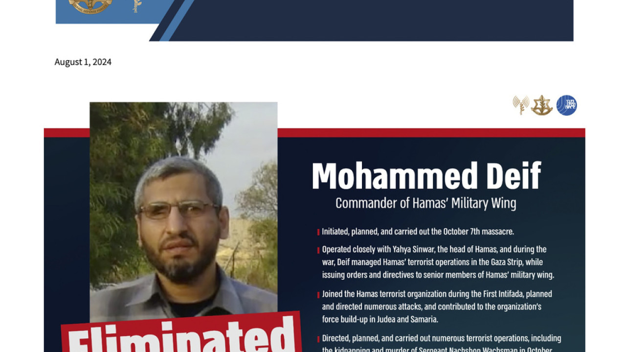 «Οι IDF (Ισραηλινές Αμυντικές Δυνάμεις) ανακοινώνουν ότι στις 13 Ιουλίου του 2024 μαχητικά αεροσκάφη των IDF έπληξαν την περιοχή της Χαν Γιούνις και ύστερα από αξιολόγηση των μυστικών πληροφοριών μπορεί να επιβεβαιωθεί ότι ο Μοχάμεντ Ντέιφ εξουδετερώθηκε στο χτύπημα», ανακοίνωσε ο στρατός.