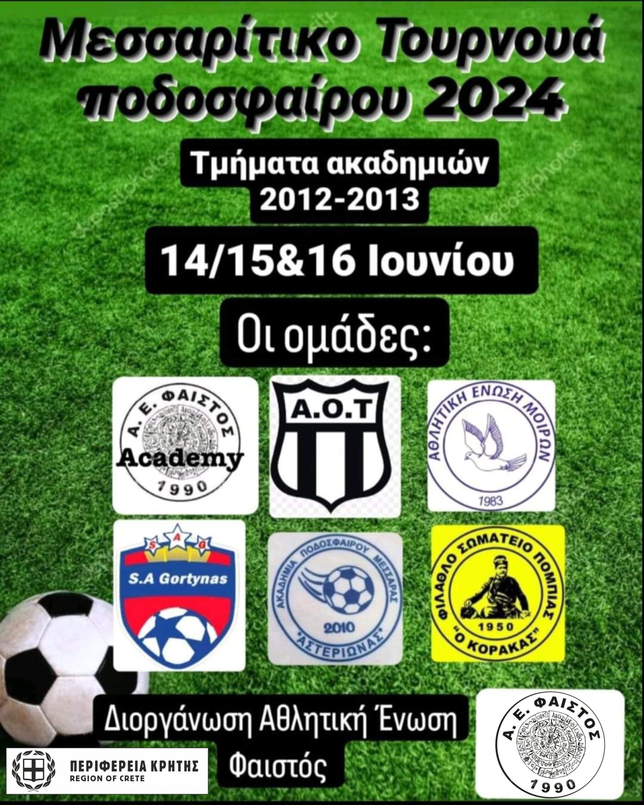 Η Αθλητική Ένωση Φαιστού διοργανώνει το Μεσσαρίτικο τουρνουά ποδοσφαίρου 2024 με τη στήριξη της Περιφέρειας Κρήτης την Παρασκευή 14 Ιουνίου, Σάββατο 15 Ιουνίου και Κυριακή 16 Ιουνίου από τις 18.00 έως τις 22.00 στο γήπεδο Βώρων.