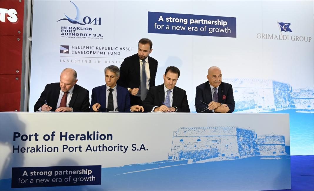 Η υπογραφή της συμφωνίας για τη μεταβίβαση των μετοχών και την καταβολή του τιμήματος πραγματοποιήθηκε στις εγκαταστάσεις της ΟΛΗ Α.Ε. στο Ηράκλειο Κρήτης, παρουσία του Υπουργού Εθνικής Οικονομίας και Οικονομικών, Κωστή Χατζηδάκη, του Υπουργού Ναυτιλίας και Νησιωτικής Πολιτικής, Χρήστου Στυλιανίδη, του Α Αντιπροέδρου της Βουλής των Ελλήνων, Γιάννη Πλακιωτάκη, του Θεοφιλέστατου Επισκόπου Κνωσσού, Μεθόδιου, του Περιφερειάρχη Κρήτης, Σταύρου Αρναουτάκη, του Δημάρχου Ηρακλείου, Αλέξη Καλοκαιρινού, του Διευθύνοντος Συμβούλου του ΤΑΙΠΕΔ, Δημήτρη Πολίτη, του Προέδρου και Διευθύνοντος Συμβούλου της Grimaldi Euromed S.p.A., Emanuele Grimaldi, του Διευθύνοντος Συμβούλου των Μινωικών Γραμμών, Λουκά Σιγάλα, του Προέδρου και Διευθύνοντος Συμβούλου της εταιρείας «Συμμετοχές Λιμένος Ηρακλείου Α.Ε.», Paul Kyprianou, του Concessions Senior Manager του Growthfund, Δημήτρη Κωνσταντακόπουλου, του Διευθύνοντος Συμβούλου της ΟΛΗ Α.Ε., Μηνά Παπαδάκη, του Προέδρου του Διοικητικού Συμβουλίου της ΟΛΗ Α.Ε., Ιωάννη Βαρδαβά, και στελεχών του ΤΑΙΠΕΔ.