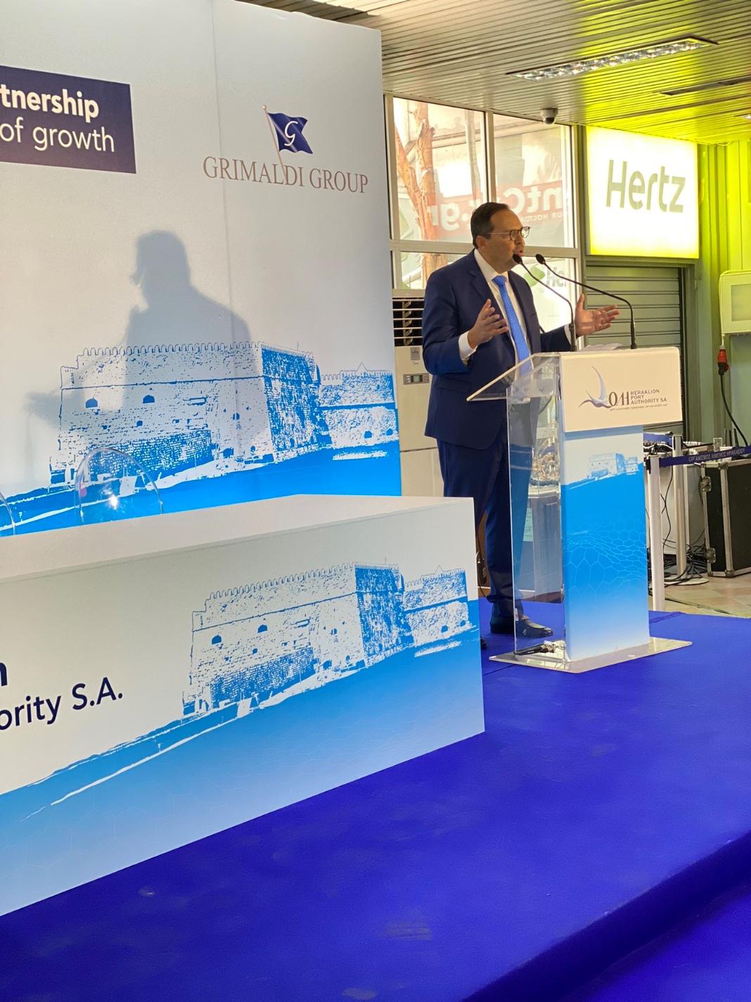 Ανέφερε επίσης πως «η σημερινή ημέρα σηματοδοτεί το τέλος μιας εποχής και το ξεκίνημα μιας πολλά υποσχόμενης νέας περιόδου όχι μόνο για το λιμάνι, τη πόλη μας, το νησί μας αλλά για όλη τη χώρα μας». Τόνισε την ανάπτυξη της κρουαζιέρας βασικό πυλώνα της ανάπτυξης του ΟΛΗ αναφέροντας ότι «μετατρέψαμε την κρίση της πανδημίας σε ευκαιρία και εστιάσαμε στην κρουαζιέρα όπου πετύχαμε αύξηση των επιβατών φτάνοντας το ρεκόρ των 500.000 επιβατών για το 2024. Όμως το κορυφαίο επίτευγμα αποτελεί το όραμά μας για ένα πράσινο λιμάνι. Θέσαμε τις βάσεις για τον πράσινο μετασχηματισμό με αιχμή το έργο την ολοκλήρωση του Electriport που αφορά την ηλεκτροδότηση πλοίων από στεριάς και το Hupiness που αφορά την θωράκιση του προσήνεμου μόλου και την παραγωγή ηλεκτρικής ενέργειας από τα κύματα. Ο Ομιλος Grimaldi έχοντας ως κορυφαία προτεραιότητά του την απανθρακοποίηση της ναυτιλίας αλλά και την μεγάλη τεχνογνωσία που διαθέτει θα προχωρήσουμε στην υλοποίηση του οράματος του πράσινου μετασχηματισμού σύντομα δε θα ανακοινώσουμε τις πρώτες πράσινες δράσεις υπό την νέα διοίκηση, καθιστώντας το λιμάνι του ρακλείου πρότυπο λιμάνι σε όλη τη Μεσόγειο».