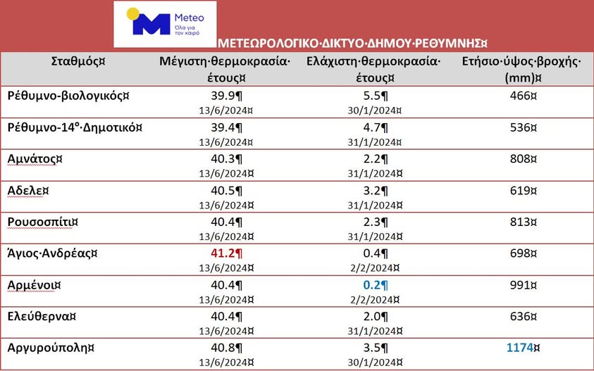 Το 2024 ήταν το πρώτο έτος πλήρους λειτουργίας του συνόλου δικτύου των 9 μετεωρολογικών σταθμών και των 2 υδρομετρικών σταθμών (σταθμήμετρα) του Συστήματος Έγκαιρης Προειδοποίησης που λειτουργεί η μονάδα ΜΕΤΕΟ του Εθνικού Αστεροσκοπείου Αθηνών σε συνεργασία με το Δήμο Ρεθύμνης.