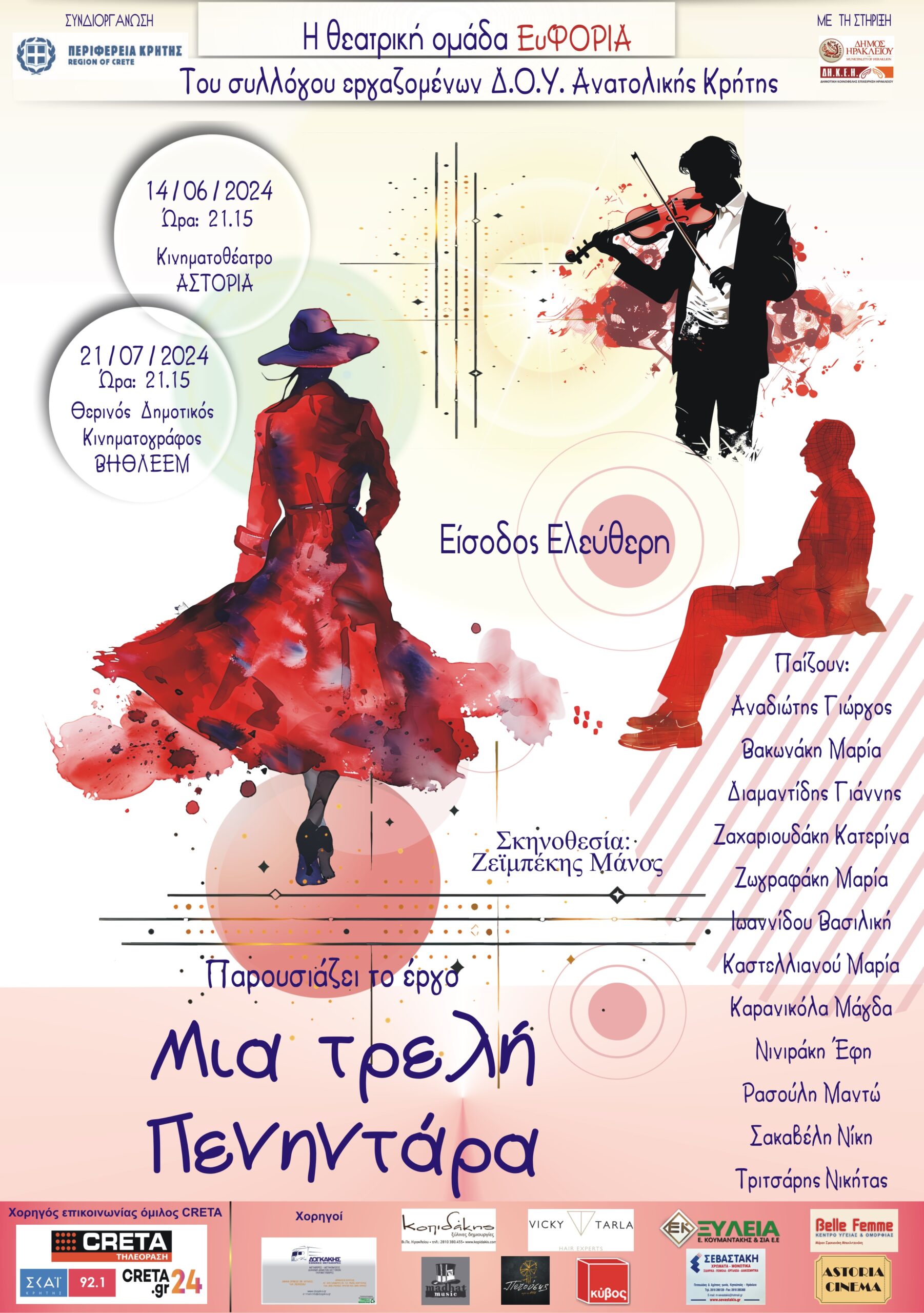 Είναι τα 50 τα νέα 40; Ο έρωτας χρόνια κοιτά; Είναι ο έρωτας τυφλός ή μήπως είναι και κουφός; Ανακάλυψε τελικά ο Φρόιντ το “τι κρύβει το υποσυνείδητο;” Μια πενηντάρα, η οικογένεια της, η φίλη της, δύο επίδοξοι εραστές και ένα βιολί θα δώσουν τις απαντήσεις στην θεατρική παράσταση “Μια Τρελή Πενηντάρα” που παρουσιάζει η θεατρική ομάδα του Συλλόγου εργαζομένων ΔΟΥ Ανατολικής Κρήτης.