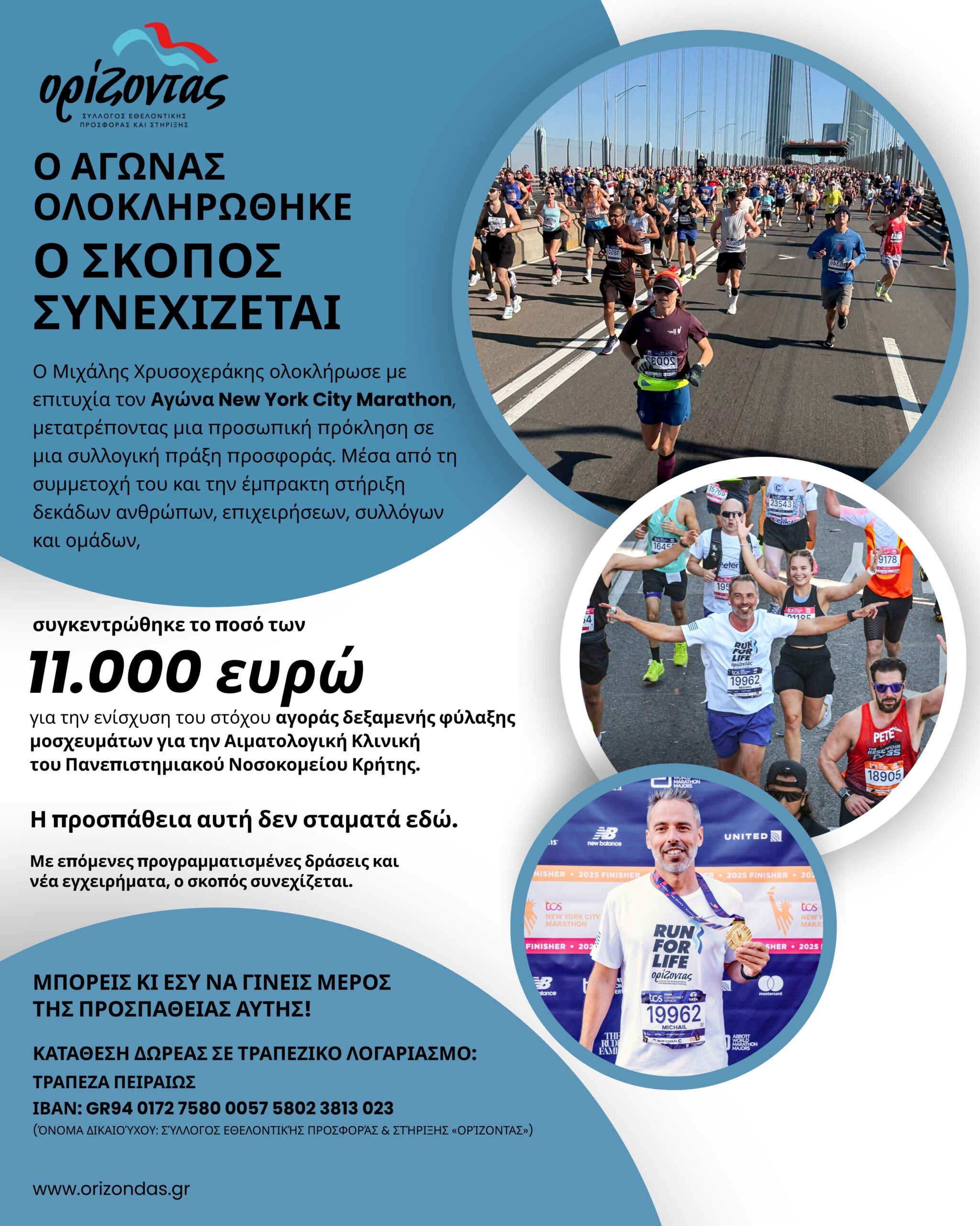 Ο Μιχάλης Χρυσοχεράκης ολοκλήρωσε με επιτυχία τον Αγώνα New York City Marathon, μετατρέποντας μια προσωπική πρόκληση σε μια συλλογική πράξη προσφοράς. Μέσα από τη συμμετοχή του και την έμπρακτη στήριξη δεκάδων ανθρώπων, επιχειρήσεων, συλλόγων και ομάδων, συγκεντρώθηκε το ποσό των 11.000 ευρώ για την ενίσχυση του στόχου αγοράς δεξαμενής φύλαξης μοσχευμάτων για την Αιματολογική Κλινική του Πανεπιστημιακού Νοσοκομείου Κρήτης.