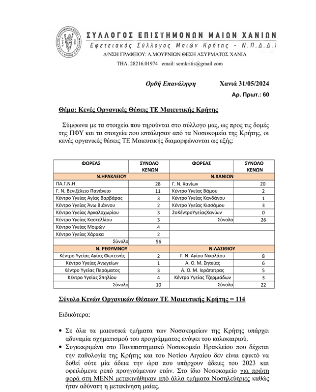 Θέμα: Να γίνουν άμεσα όλες οι απαραίτητες μόνιμες προσλήψεις μαιών και μαιευτών σε όλα τα νοσοκομεία της Κρήτης