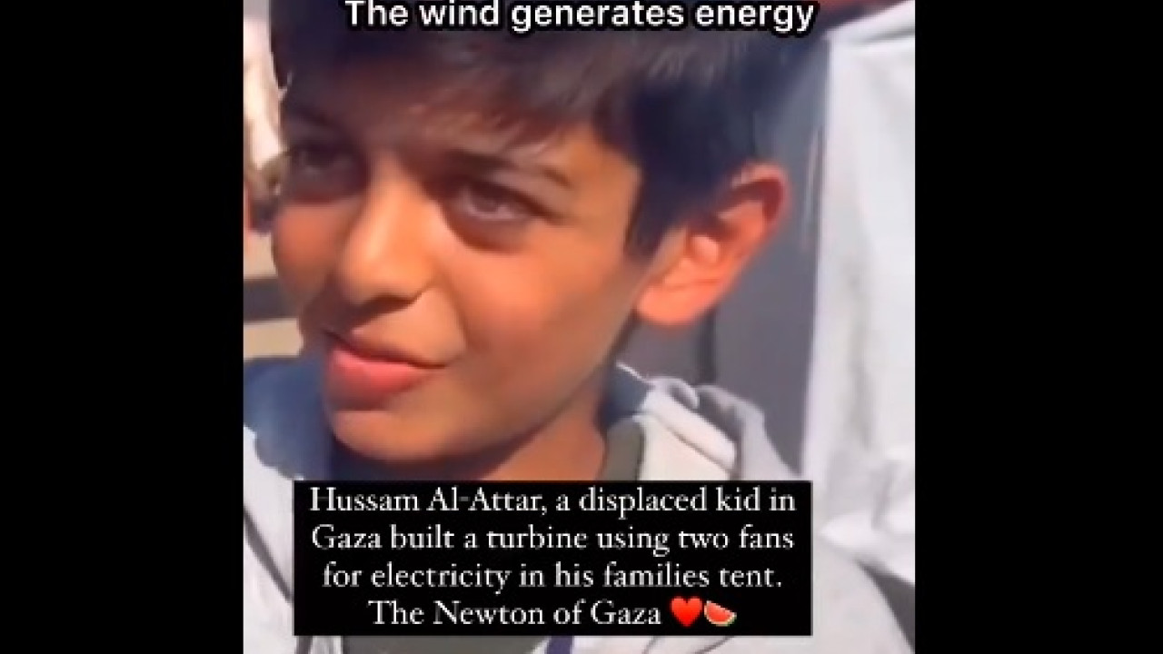 Με δύο ανεμιστήρες από τα παλιοσίδερα και λίγα καλώδια ο 14χρονος Χουσάμ Αλ-Ατάρ κατασκεύασε την δική του πηγή παραγωγής ηλεκτρικού ρεύματος για να φωτίσει την σκηνή όπου ζουν αυτός και η οικογένειά του κοντά στην Ράφα αφού αναγκάστηκαν να εγκαταλείψουν το σπίτι τους λόγω του πολέμου στην Λωρίδα της Γάζας.