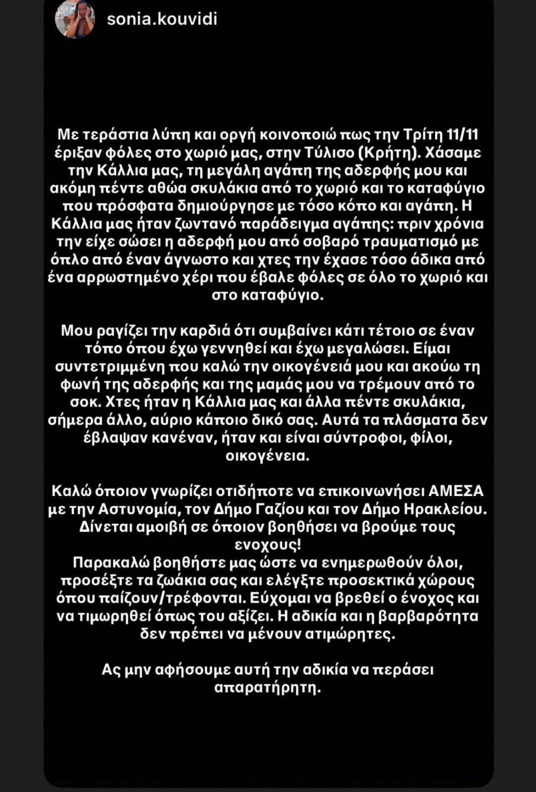 Σύμφωνα με τα όσα δημοσιεύει στον λογαριασμό της στο instagram η Ηρακλειώτισσα δημοσιογράφος Σοφία Κουβίδη, ανάμεσα στα σκυλάκια που έχασαν τη ζωή τους είναι και η Κάλλια, την οποία πριν από χρόνια είχε σώσει η αδερφή της όταν είχε τραυματιστεί σοβαρά από όπλο.