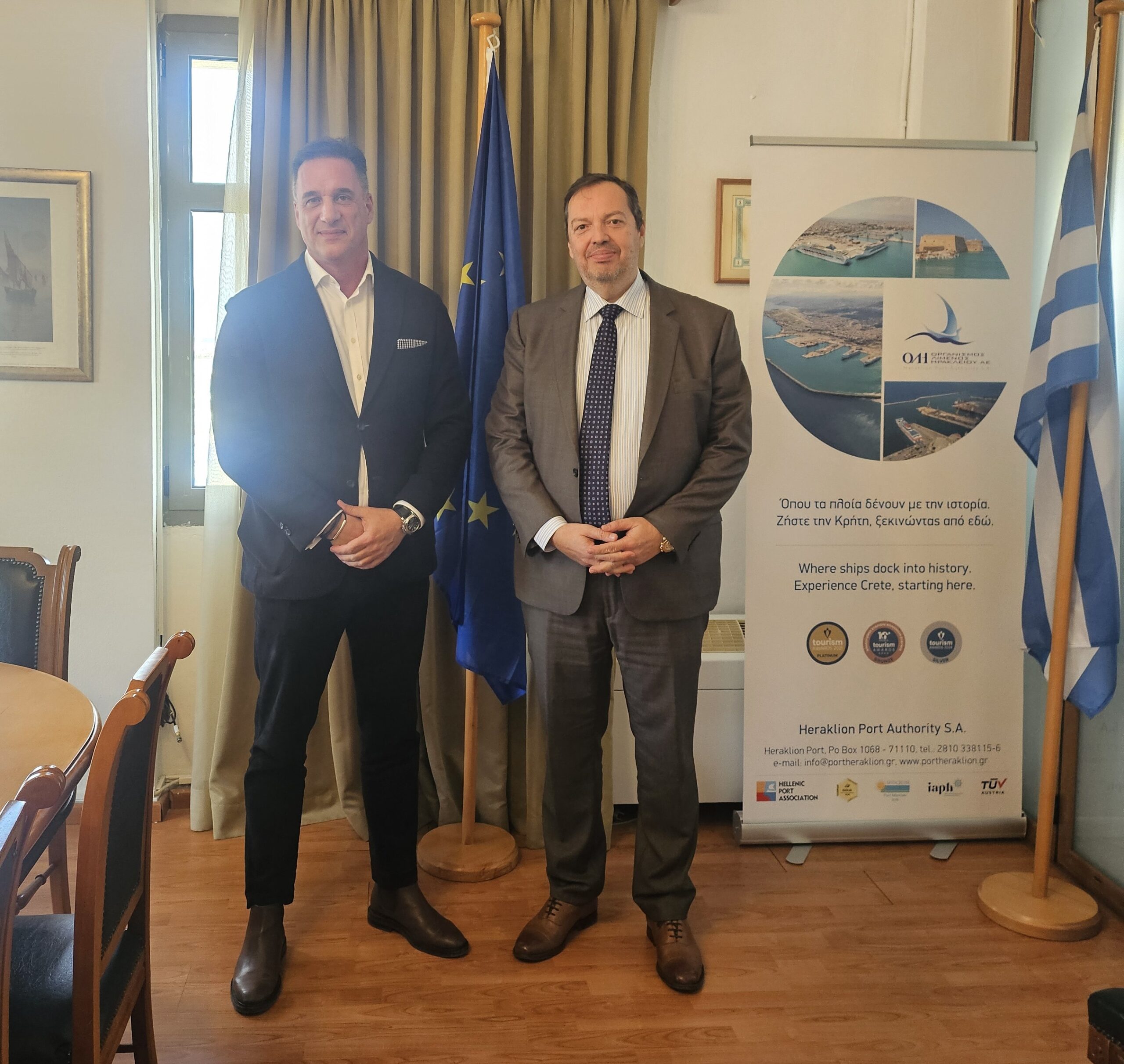 Συνάντηση στρατηγικού χαρακτήρα πραγματοποιήθηκε μεταξύ του Διευθύνοντος Συμβούλου του Οργανισμού Λιμένος Ηρακλείου Α.Ε., κ. Μηνά Παπαδάκη, και του Διευθύνοντος Συμβούλου της εταιρείας Διεθνής Αερολιμένας Ηρακλείου Κρήτης Α.Ε., κ. Νίκου Αναστασίου, με αντικείμενο την περαιτέρω ενίσχυση της θέσης του Ηρακλείου ως ανταγωνιστικού homeport κρουαζιέρας στη Μεσόγειο.