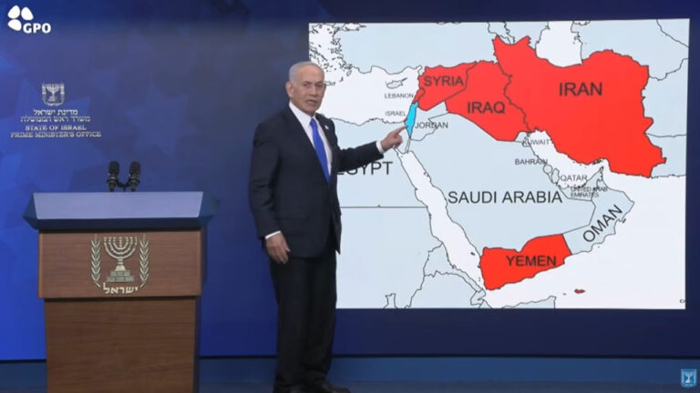 Δείχνοντας έναν χάρτη της Μέσης Ανατολής, όπου ο ιρανικός «άξονας της αντίστασης», όπως τον χαρακτηρίζει η Τεχεράνη, ή ο «άξονας του κακού» κατά το Ισραήλ, ο Νετανιάχου ανέφερε ότι «ήθελαν να μας στραγγαλίσουν, αλλά τους στραγγαλίζουμε εμείς».