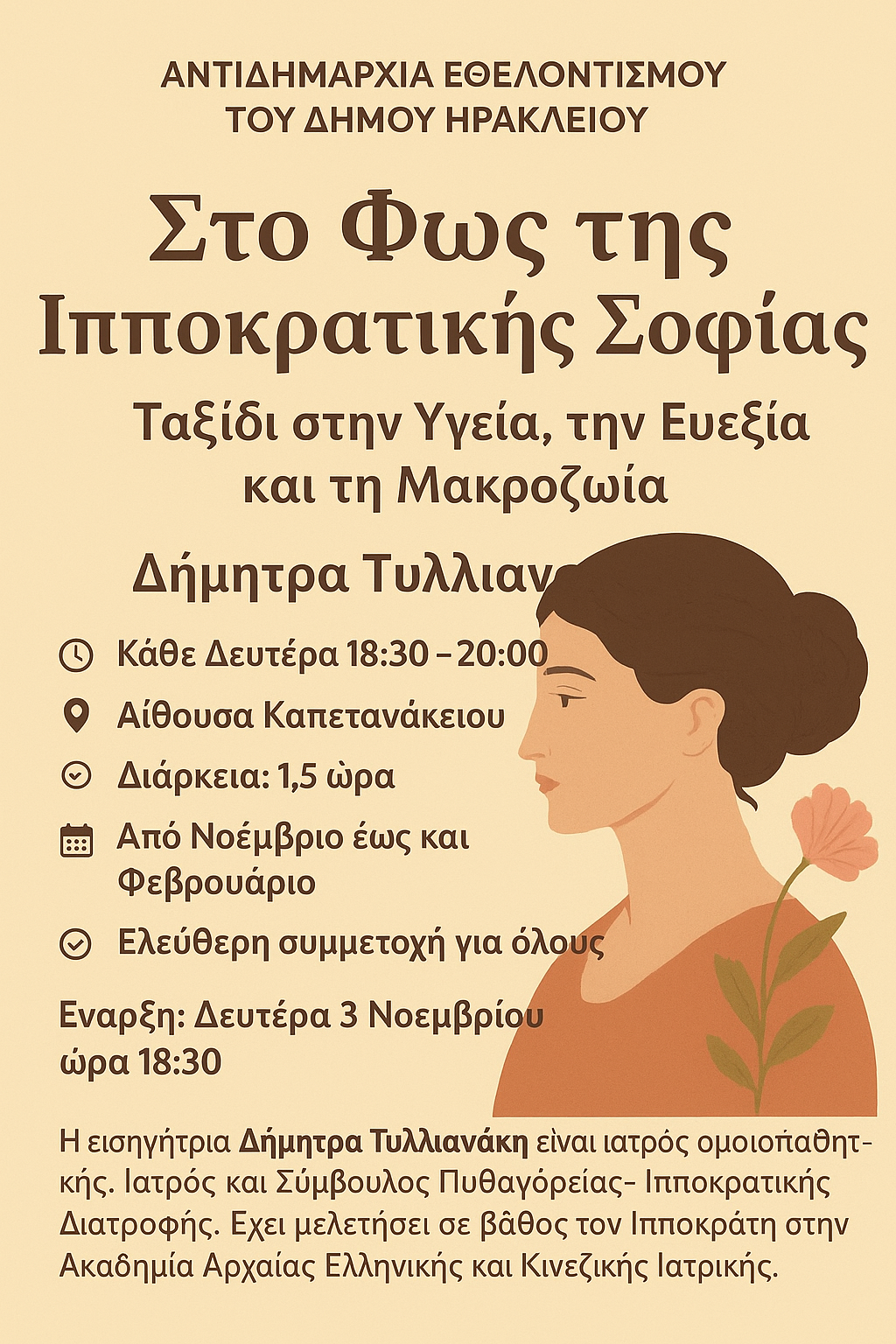 Νέο σεμινάριο με τίτλο «Στο Φως της Ιπποκρατικής Σοφίας-Ταξίδι στην Υγεία, την Ευεξία και τη Μακροζωία» ξεκινάει τη Δευτέρα 3 Νοεμβρίου στο πλαίσιο του κύκλου «Δια… Δήμου Μάθηση» που διοργανώνει η Αντιδημαρχία Εθελοντισμού του Δήμου Ηρακλείου.