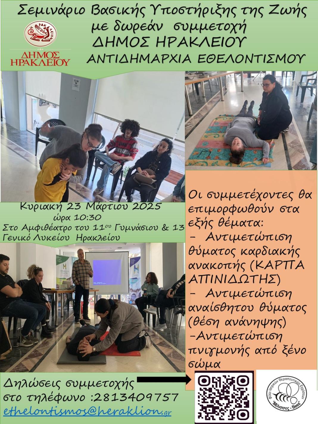 Νέο σεμινάριο Βασικής Υποστήριξης της Ζωής θα πραγματοποιηθεί την Κυριακή 23 Μαρτίου από τον Δήμο Ηρακλείου στο πλαίσιο των δράσεων της Αντιδημαρχίας Εθελοντισμού με τίτλο «Προσφορά στο συνάνθρωπο». Η δράση υλοποιείται σε συνεργασία με την ομάδα εθελοντών «Οι φίλοι Ιατρικών Θεραπευτικών Εγχύσεων Μέλισσες-Bees», υπό την εποπτεία του φυσίατρου Λάζαρου Βακιρτζιάν.