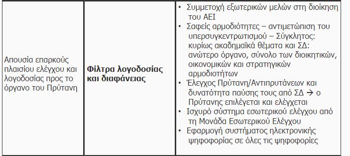 Συνεπώς, η ενσωμάτωση του Πρύτανη εντός του Συμβουλίου Διοίκησης, δεδομένων των ισχυρών μηχανισμών ελέγχων εντός και εκτός του Συμβουλίου, διασφαλίζει τη λογοδοσία. Παράλληλα, διασφαλίζει την αποφυγή της διαρχίας που θα ήταν αναπόφευκτη αν ο Πρύτανης βρισκόταν εκτός του Συμβουλίου, με αποτέλεσμα να διαμορφώνονταν δύο ανταγωνιστικοί πόλοι εξουσίας, το Συμβούλιο Διοίκησης (από τη μια πλευρά) και ο Πρύτανης (από την άλλη πλευρά).