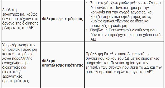 - Η συμμετοχή 5 εξωτερικών μελών στο Συμβούλιο Διοίκησης του ΑΕΙ επιλεγμένων με αυξημένη πλειοψηφία 5/6 εγγυάται τον έλεγχο της διοικητικής αυθαιρεσίας.