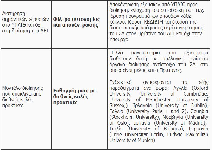 Το προτεινόμενο μοντέλο διοίκησης ευθυγραμμίζει το πανεπιστημιακό μοντέλο διοίκησης με διεθνείς καλές πρακτικές, καθώς πολλά πανεπιστήμια του εξωτερικού διαθέτουν δομή συλλογικό ανώτατο όργανο διοίκησης αντίστοιχο του ΣΔ, στο οποίο είναι μέλος και ο Πρύτανης. Ενδεικτικά αναφέρονται τα εξής παραδείγματα ανά χώρα: Αγγλία (Oxford University, University of Cambridge, University of Manchester, University of Sussex,), Ιρλανδία (University of Dublin), Γαλλία (University Paris 1 and 2), Σουηδία (Stockholm University), Νορβηγία (University of Oslo), Ισπανία (University of Madrid), Ιταλία (University of Bologna), Γερμανία (Freie Universitat Berlin, Ludwig Maximilian University of Munich).