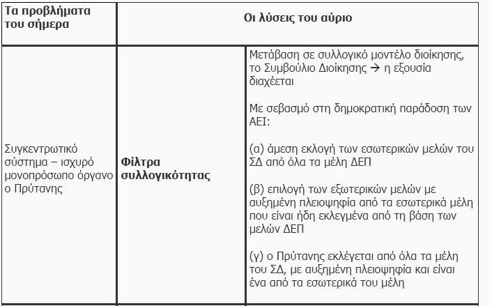 - Το προτεινόμενο μοντέλο διοίκησης ενσωματώνει τον Πρύτανη μέσα στο Συμβούλιο Διοίκησης. Στην πράξη, αυτό σημαίνει ότι ο «ελέγχων» φορέας (Συμβούλιο Διοίκησης) ταυτίζεται με τον «ελεγχόμενο» (Πρύτανης);