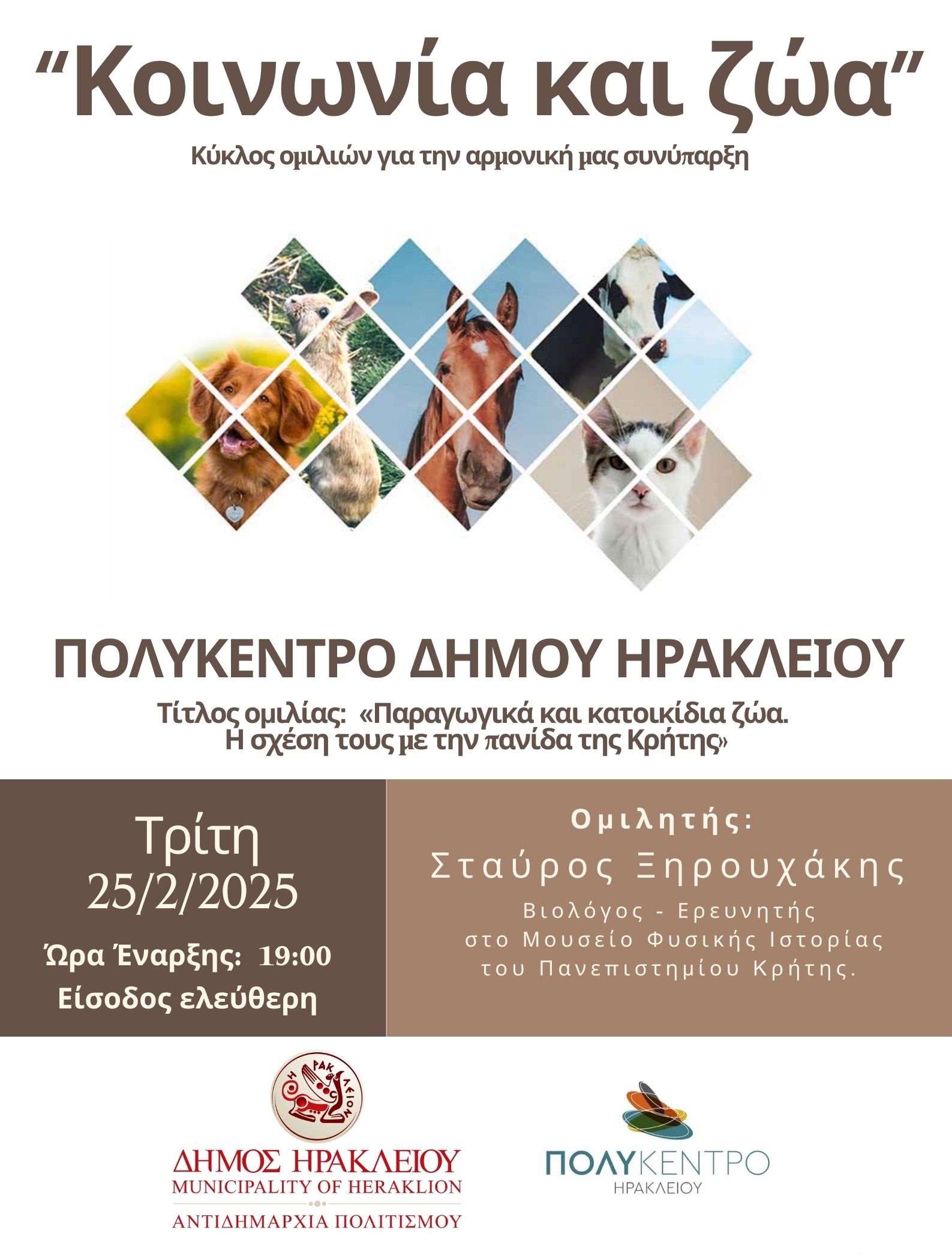 Ένας νέος κύκλος ομιλιών με την ονομασία «Κοινωνία και Ζώα» και με ελεύθερη είσοδο για το κοινό, ξεκινά από τον Δήμο Ηρακλείου και την Αντιδημαρχία Πολιτισμού.