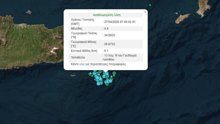 Νέος σεισμός 4,4 Ρίχτερ στα ανοιχτά του Λασιθίου σημειώθηκε λίγο πριν τις 11 το το πρωί της Δευτέρας (27/4), καθώς συνεχίζεται η σεισμική ακολουθία ύστερα από τον σεισμό 5,7 Ρίχτερ που έγινε την περασμένη βδομάδα.