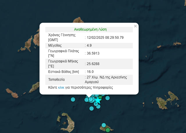 O σεισμός μεγέθους 4,9 Ρίχτερ σημειώθηκε 27 χλμ. νοτιοδυτικά της Αρκεσίνης Αμοργού