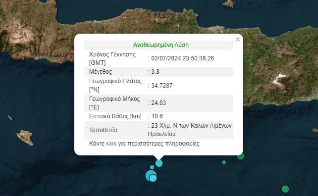 Νέα σεισμική δόνηση μεγέθους 3,8 βαθμών της κλίμακας Ρίχτερ, σημειώθηκε τα ξημερώματα της Τετάρτης, στις 02:50, νότια του Ηρακλείου.