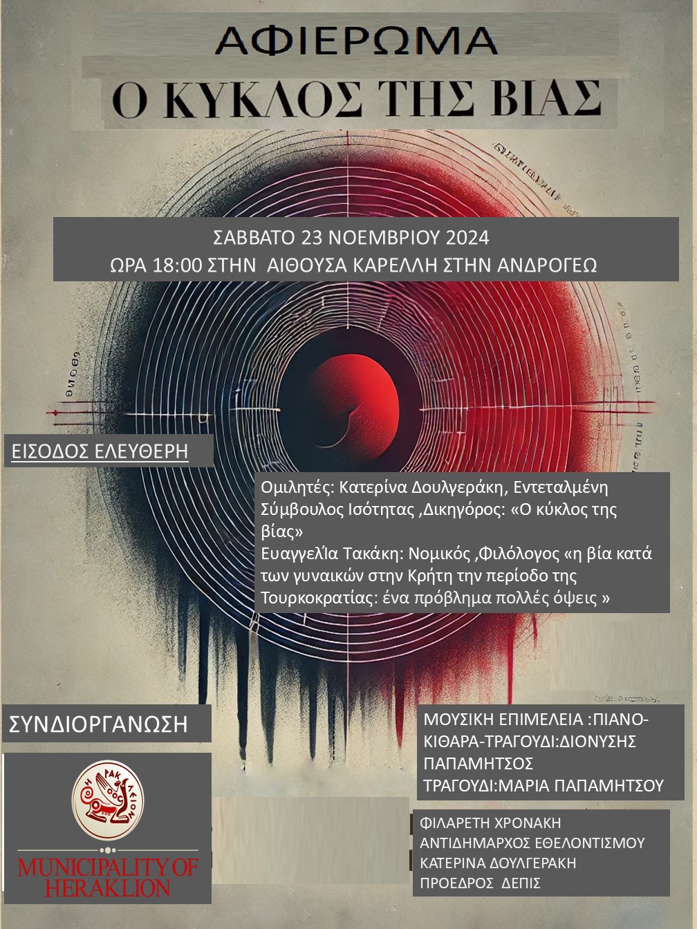 Ο Δήμος Ηρακλείου μέσω της Αντιδημαρχίας Εθελοντισμού διοργανώνει εκδήλωση με θέμα «Ο κύκλος της βίας» σε συνεργασία με την δικηγόρο και Εντεταλμένη Σύμβουλο του Δήμου Ηρακλείου σε θέματα Ισότητας Κατερίνα Δουλγεράκη.
