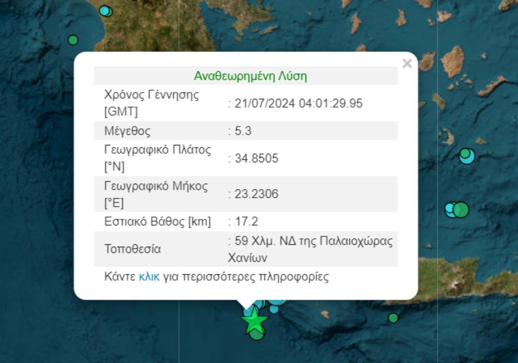 Υπενθυμίζεται πως σύμφωνα με την Αναθεωρημένη Λύση του Γεωδυναμικού Ινστιτούτου του Αστεροσκοπείου Αθηνών η σεισμική δόνηση σημειώθηκε στις 7:01 το πρωί 59 χιλιόμετρα νοτιοδυτικά της Παλαιόχωρας.
