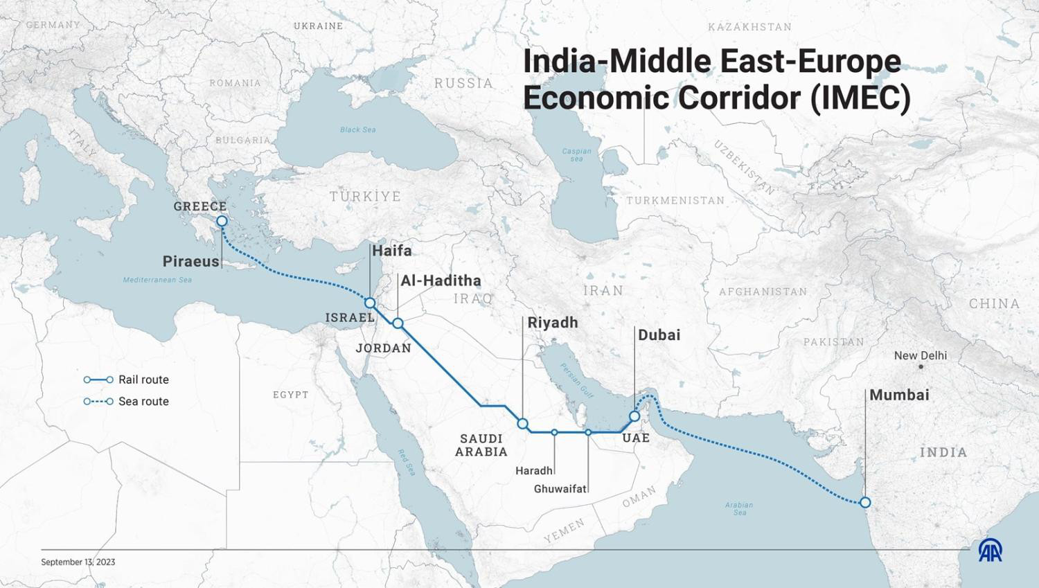 Η πρώτη μεταφορά ενός εμπορευματοκιβωτίου (container) που καλύπτει ολόκληρη την αλυσίδα εφοδιασμού διενεργήθηκε πρόσφατα από το Mundra (Ινδία) δια θαλάσσης στο Jebel Ali στα Ηνωμένα Αραβικά Εμιράτα, από εκεί μέσω σιδηροδρόμου στη Σαουδική Αραβία και Ιορδανία, Ισραήλ και από Χάιφα προς Πειραιά. Ο συνολικός χρόνος διαδρομής μόλις 14 ημέρες, μια αξιοσημείωτη μείωση σχεδόν 40% σε σύγκριση με την παραδοσιακή διέλευση μέσω Διώρυγας του Σουέζ. Ο κολοσσός των logistics Maersk, που συμμετείχε στο πιλοτικό εγχείρημα, χαρακτήρισε το πέρασμα αλλαγή του παιχνιδιού για την ανθεκτικότητα της Ευρασιατικής εφοδιαστικής αλυσίδας μέσω του Ινδικού Δρόμου του Μεταξιού.