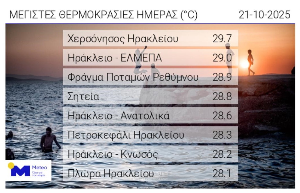 Για ακόμη μια φορά, στην Κρήτη καταγράφηκε πανελλαδικό ρεκόρ υψηλών θερμοκρασιών. Σύμφωνα με τους σταθμούς μέτρησης του meteo/Εθνικού Αστεροσκοπείου Αθηνών, σήμερα Τρίτη 21/10, το θερμόμετρο στη Χερσόνησο έδειξε 29.7 βαθμούς κελσίου, ενώ κοντά στους 30 βαθμούς ήταν οι θερμοκρασίες και σε άλλες περιοχές του νησιού.