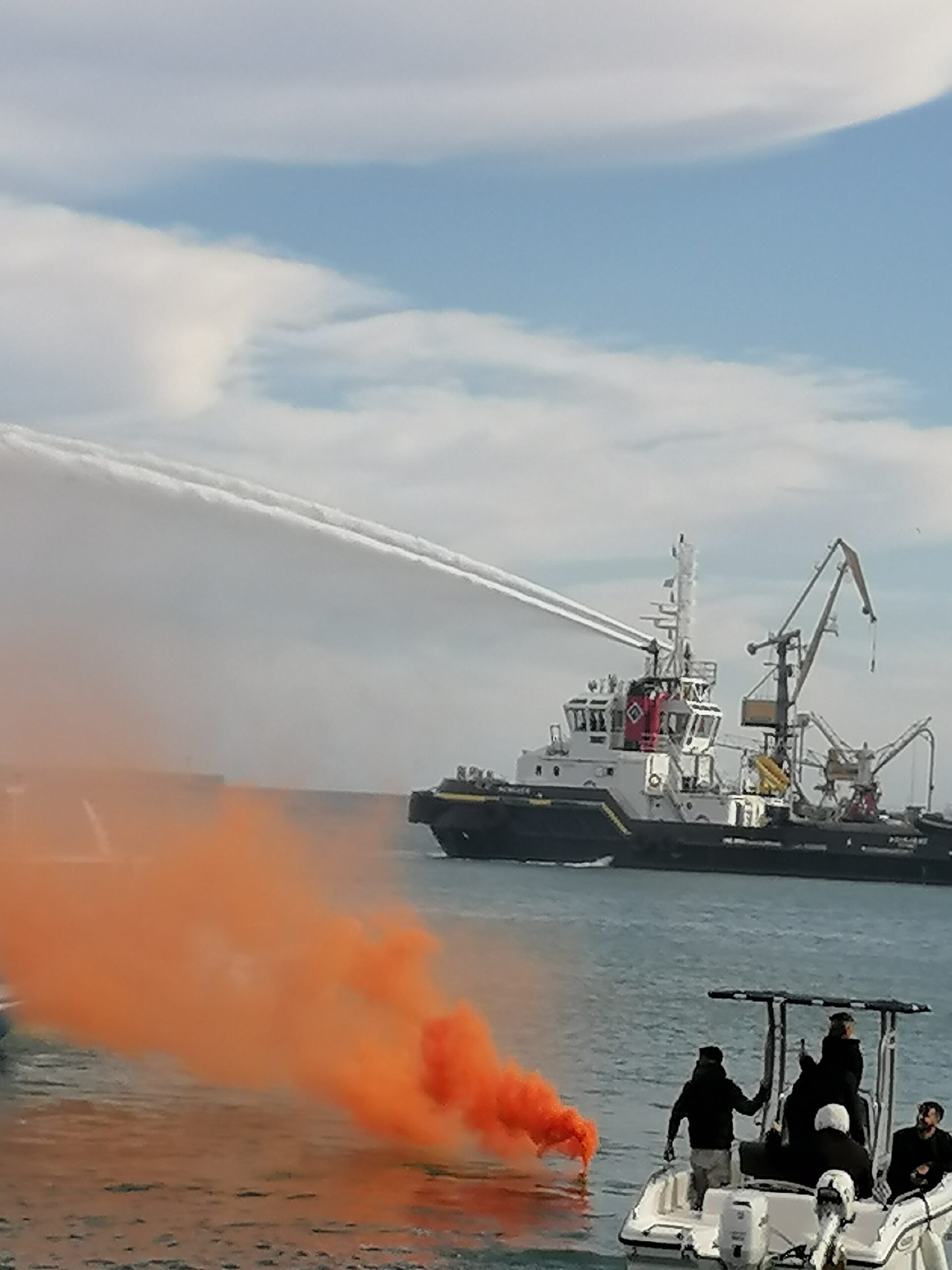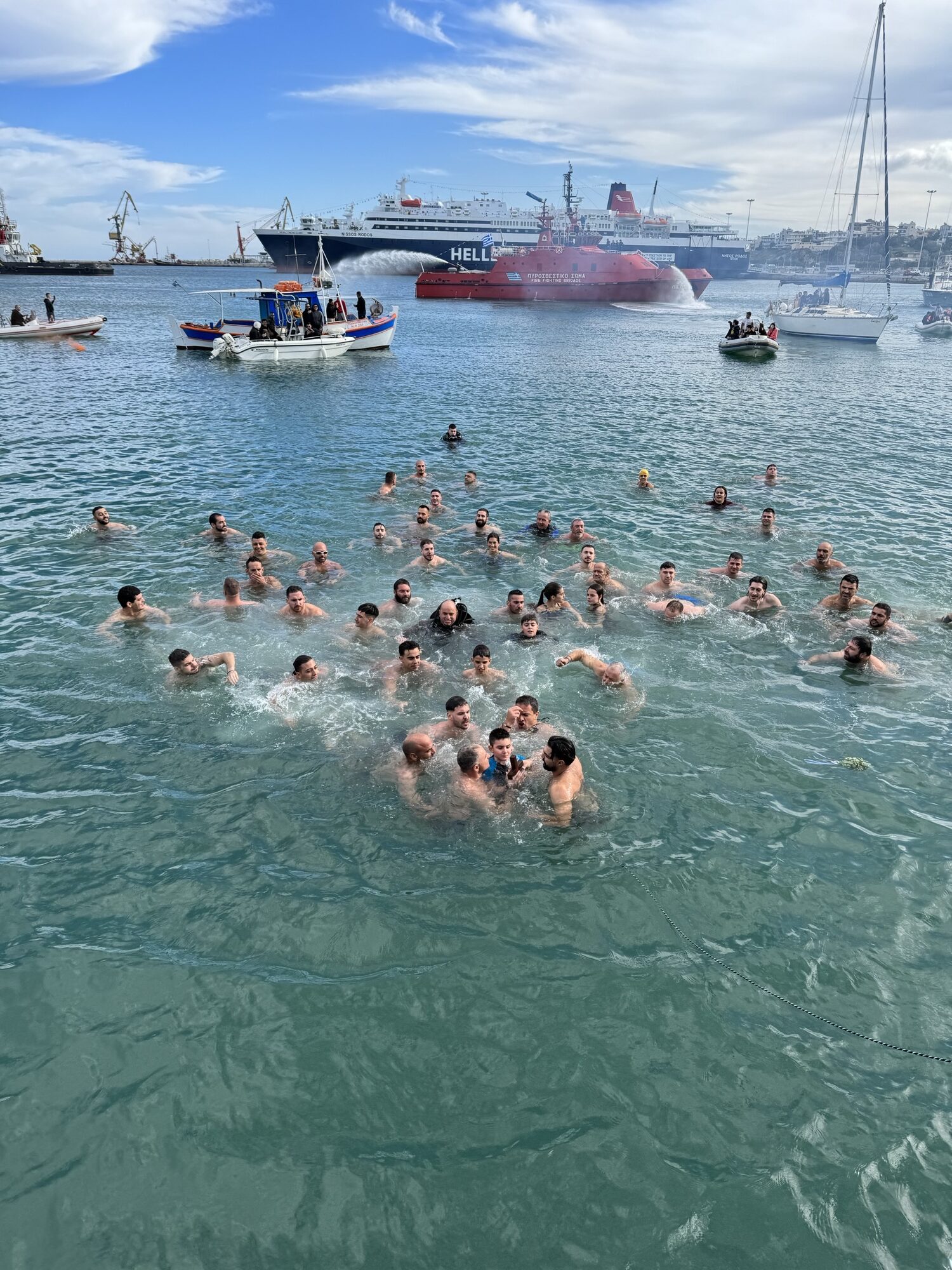 Σκάφη της Πυροσβεστικής Υπηρεσίας και του Λιμενικού δημιούργησαν υδάτινους πίδακες που εντυπωσίασαν τους παρευρισκόμενους ενώ ηχούσαν δυνατά οι κόρνες των σκαφών , αναγγέλλοντας το καινούργιο, το νέο, το χαρμόσυνο και ελπιδοφόρο μήνυμα της φώτισης και της καθαρτήριας αναγέννησης