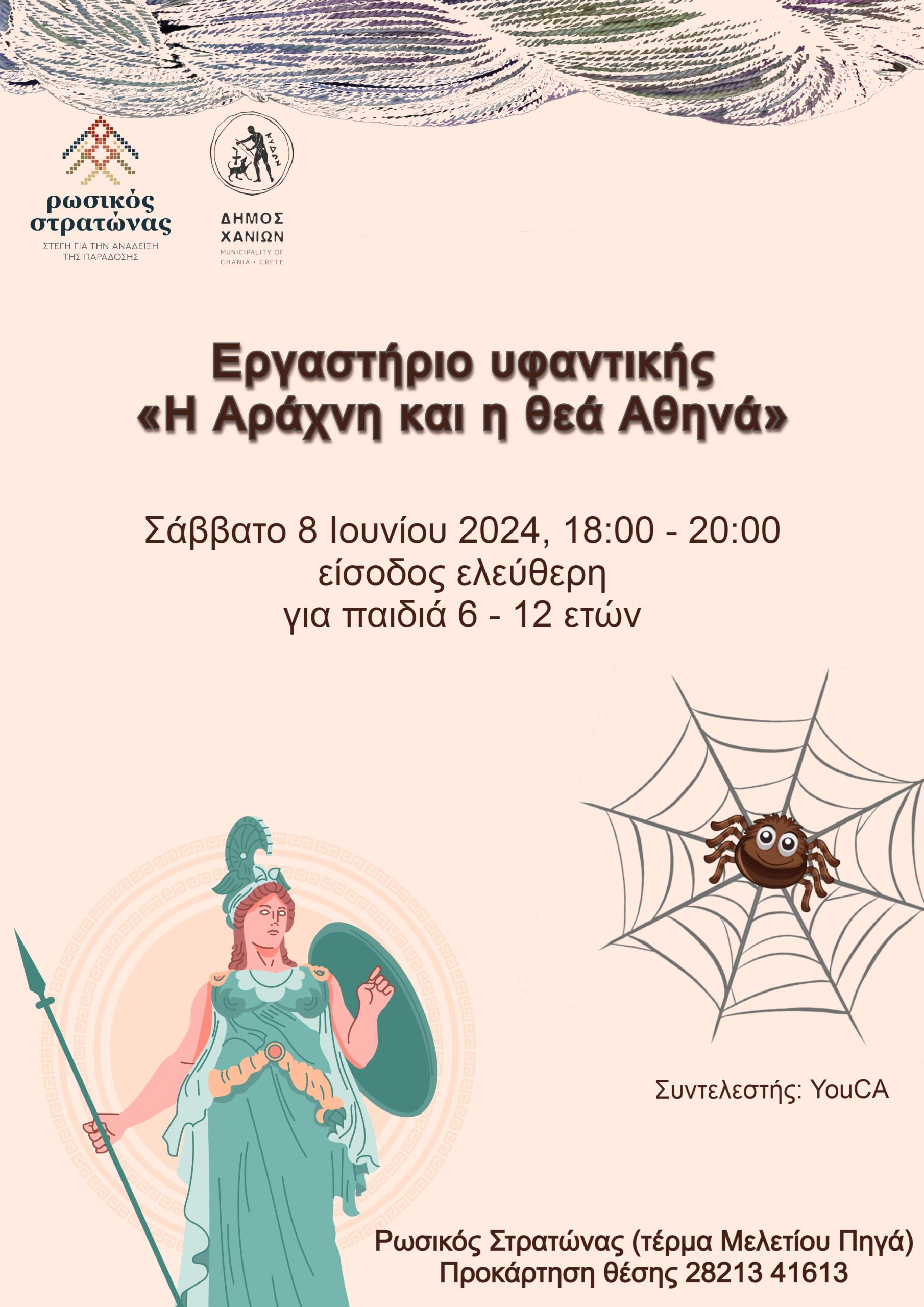 Την ίδια μέρα, το απόγευμα στις 18:00 τα παιδιά από 6 έως 12 ετών θα έχουν την ευκαιρία να έρθουν σε επαφή με το επάγγελμα της υφάντρας. Μέσω της πολυαισθητηριακής δράσης: «H Αράχνη και η θεά Αθηνά», τα παιδιά θα γνωρίσουν με ευχάριστο τρόπο την τέχνη της υφαντικής, θα παίξουν, θα πειραματιστούν βάφοντας νήματα με φυτικές βαφές, θα ακούσουν σχετικούς μύθους και λαϊκά παραμύθια και τελικά θα υφάνουν με τη σειρά τους σε χειροποίητους αργαλειούς.