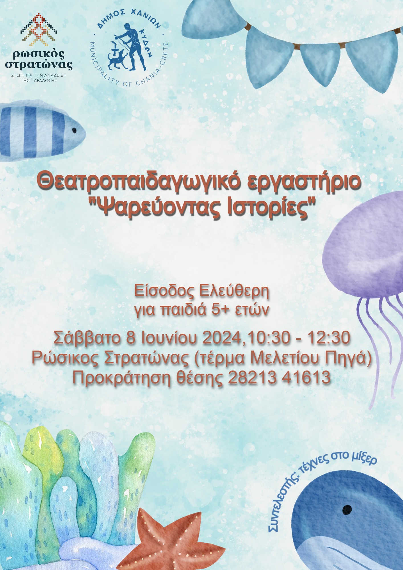 Έτσι, το Σάββατο 8 Ιουνίου 2024 στον Ρωσικό Στρατώνα του Δήμου Χανίων, στις 10:30 π.μ. τα παιδιά θα έχουν την ευκαιρία να παρακολουθήσουν το θεατροπαιδαγωγικό πρόγραμμα “Ψαρεύοντας Ιστορίες” και να μάθουν περισσότερα σχετικά με το επάγγελμα του ψαρά. Το πρόγραμμα περιλαμβάνει αφηγήσεις λαϊκών και κλασικών ιστοριών, μύθων και θρύλων, εικαστική κατασκευή ψαριών και πολλές κινητικές και θεατρικές δραστηριότητες.