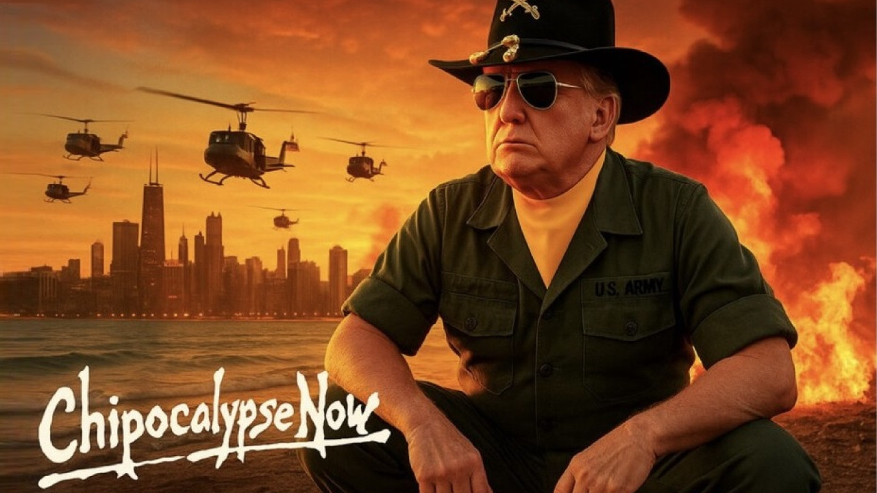 «Το Σικάγο θα καταλάβει γιατί το αποκαλούμε υπουργείο Πολέμου» ανέφερε σε μια ανάρτησή του στην πλατφόρμα Truth Social ο Τραμπ, ο οποίος απειλή εδώ και πολλές ημέρες να στείλει ομοσπονδιακούς στρατιώτες για να «επιτεθούν στην εγκληματικότητα». Η ανάρτηση περιλαμβάνει μια φωτογραφία, δημιούργημα της τεχνητής νοημοσύνης, που δείχνει τον Τραμπ με στρατιωτική στολή, με φόντο πυρκαγιές και ένα ελικόπτερο να πετά στον πορτοκαλί ουρανό του Σικάγο. «Σικαποκάλυψη Τώρα» γράφει η λεζάντα. Πρόκειται για άμεση αναφορά στην ταινία «Αποκάλυψη τώρα» του Φράνσις Φορντ Κόπολα για τον πόλεμο στο Βιετνάμ, με παραποιημένη την πασίγνωστη ατάκα του Ρόμπερτ Ντιβάλ: «Μ’ αρέσει η μυρωδιά των απελάσεων το πρωί».