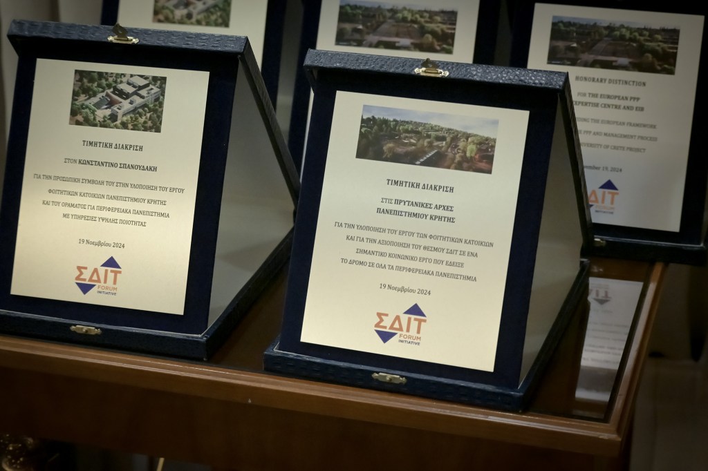 Για 4 συν 1 λόγους τιμήθηκε το Πανεπιστήμιο Κρήτης και η συμβουλευτική του ομάδα για το έργο των φοιτητικών εστιών Κρήτης που υλοποιείται με τη μέθοδο ΣΔΙΤ από το 5ο ΣΔΙΤ FORUM. Ανθρωποκεντρικές, οι τιμητικές διακρίσεις του εφετινού, πέμπτου κατά σειρά ΣΔΙΤ Forum, που πραγματοποιήθηκε τις προάλλες στην Αθήνα. υπενθύμισαν για μια ακόμα φορά, ότι πίσω από τα μεγάλα έργα, υπάρχουν οι οραματιστές τους, οι οποίοι πάλεψαν σκληρά για να γίνουν αυτά πραγματικότητα.