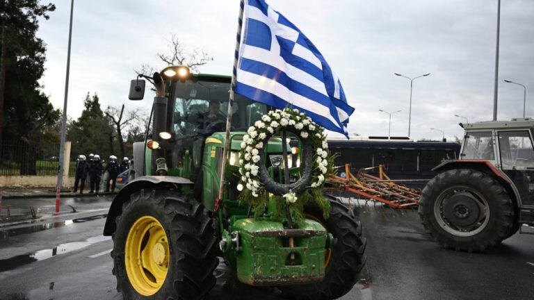 Μια διαφορετική, συμβολική εικόνα αντικρίζουν οι οδηγοί στο 90ό χιλιόμετρο της Εθνικής Οδού Αθηνών – Λαμίας, στο ύψος της Θήβας. Ανάμεσα στα παρατεταγμένα τρακτέρ και τις σκηνές που έχουν στήσει οι αγρότες για να περνούν τις νύχτες τους, δεσπόζει ένα στολισμένο χριστουγεννιάτικο δέντρο.
