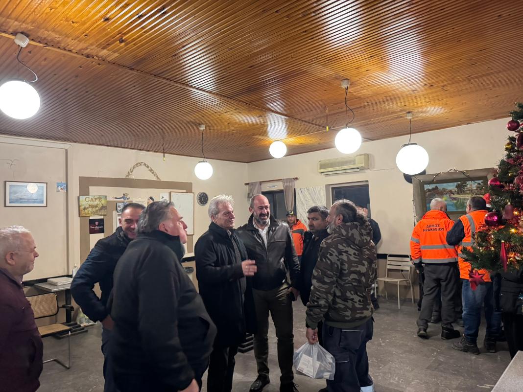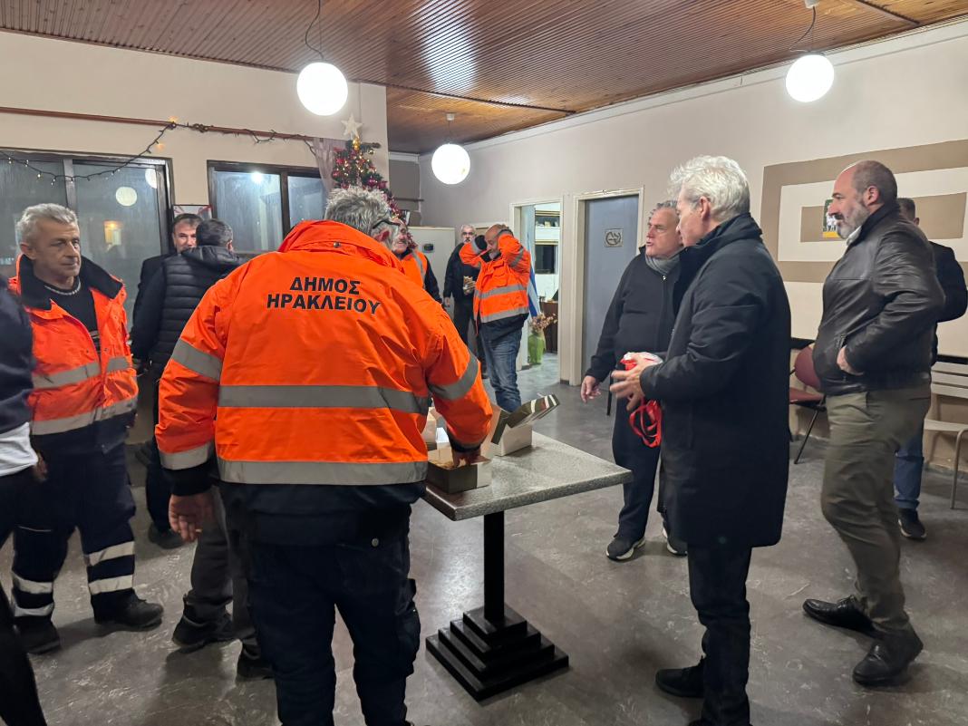 Με τους εργαζόμενους της Υπηρεσίας Καθαριότητας γιόρτασε την παραμονή της Πρωτοχρονιάς ο Δήμαρχος Ηρακλείου Αλέξης Καλοκαιρινός, συνοδευόμενος από τον Αντιδήμαρχο Καθαριότητας, Περιβάλλοντος & Ενέργειας Νίκο Γιαλιτάκη.
