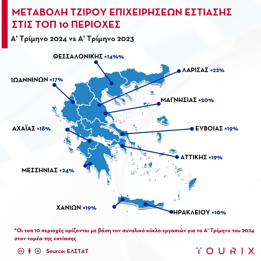 Ο τζίρος των επιχειρήσεων εστίασης της Θεσσαλίας φαίνεται επίσης αυξημένος σε σχέση με το Α’ τρίμηνο του 2023. Τα Τρίκαλα σημείωσαν αύξηση τζίρου 17% σε επίπεδο τριμήνου, η Μαγνησία παρουσίασε 20% αύξηση, ενώ η Λάρισα +22%, ο νομός της Καρδίτσας +14% και οι Σποράδες +5%.
