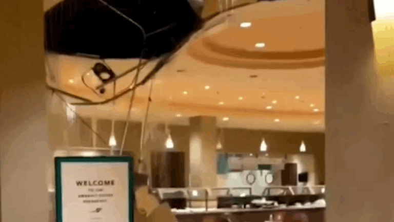 ‘THAT SUCKS’: Wild video shows a hotel ceiling collapsing and gushing water as guests eat breakfast in the lobby.