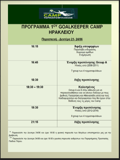 Από τις 21 έως τις 24 Ιουνίου θα πραγματοποιηθεί το 1ο Goalkeeper Camp Hρακλείου, όπου καταξιωμένοι τερματοφύλακες, θα μεταλαμπαδεύσουν τις γνώσεις και τη φιλοσοφία τους σε νέους και φιλόδοξους πορτιέρο προπονώντας τους για τέσσερις ημέρες σε ένα camp από το οποίο σίγουρα θα αποκομίσουν εμπειρίες και γνώσεις!