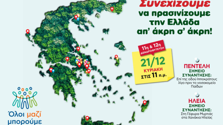 Και φέτος, συνεχίζουμε να πρασινίζουμε την Ελλάδα από άκρη σε άκρη! Η 11η και 12η δενδροφύτευση της σεζόν, αυτή την Κυριακή 21 Δεκεμβρίου στην Πεντέλη και τον Πύργο Ηλείας.