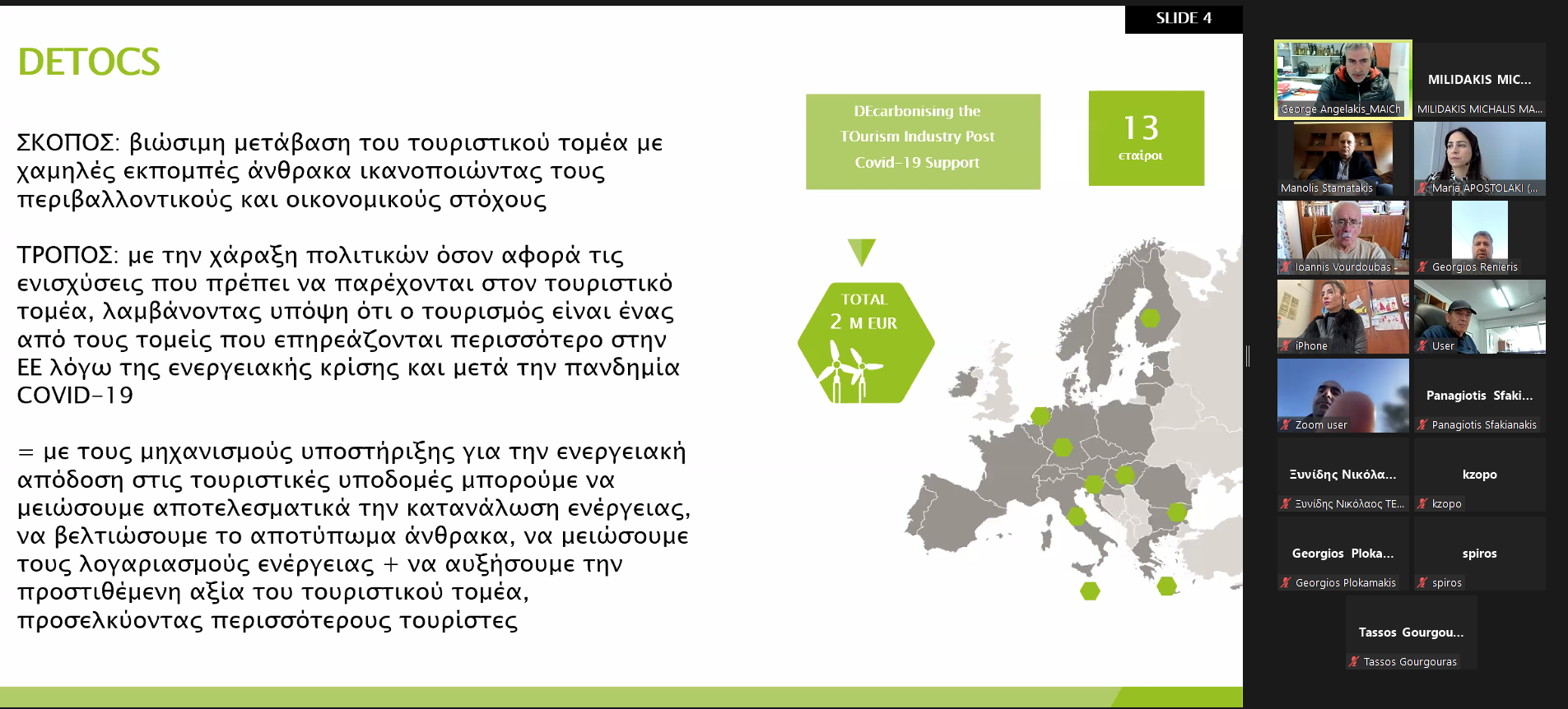 Πραγματοποιήθηκε την Πέμπτη 12/12/2024 διαδικτυακά η 4η Συνάντηση τοπικών φορέων για το ευρωπαϊκό έργο DETOCS “DEcarbonising the TOurism Industry Post Covid-19 Support, DETOCS” στα πλαίσια του Προγράμματος ΙNTERREG EUROPE, που συμμετέχει το ΜΑΙΧ και η Περιφέρεια Κρήτης. Το έργο αυτό συγχρηματοδοτείται από την Ευρωπαϊκή Ένωση και εθνικούς πόρους και αφορά στην βελτίωση πολιτικών για την απανθρακοποίηση της τουριστικής βιομηχανίας με έμφαση στις ξενοδοχειακές εγκαταστάσεις.