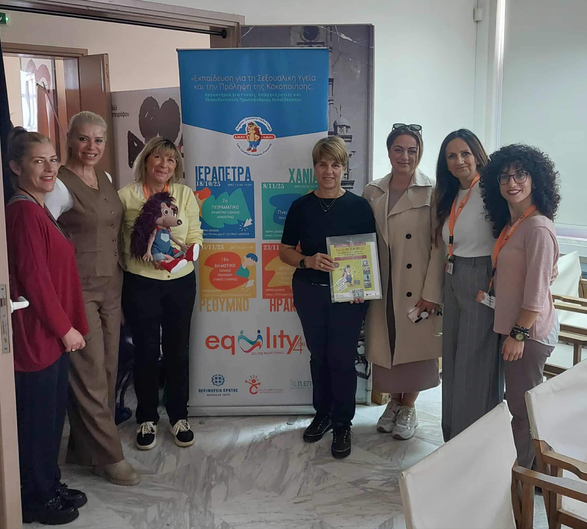 «Εκπαίδευση για τη Σεξουαλική Υγεία και την Πρόληψη της Κακοποίησης», που υλοποιήθηκε από την Περιφέρεια Κρήτης, μέσω του Αυτοτελούς Γραφείου Ισότητας, σε συνεργασία με την Α.ΞΕ.Π.Τ. – Ασφαλή Ξένοιαστα Παιδιά Τώρα, στο πλαίσιο του Περιφερειακού Προγράμματος Ισότητας των Φύλων Κρήτης 2023–2025. Η σεξουαλική εκπαίδευση, όταν είναι ολοκληρωμένη, επιστημονικά τεκμηριωμένη και βασισμένη στα ανθρώπινα δικαιώματα, παίζει καθοριστικό ρόλο στην πρόληψη της έμφυλης βίας.