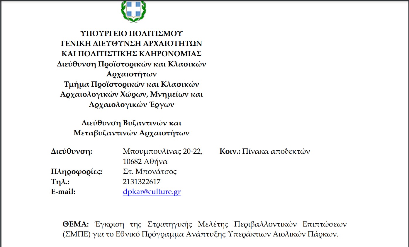 Η έγκριση δίνεται με τον όρο ότι στο επόμενο στάδιο μελετών, θα υποβληθούν μελέτες με αναλυτική τεχνική περιγραφή, ακριβή στοιχεία χωροθέτησης και φωτορεαλιστικές απεικονίσεις, προκειμένου να γίνει αντιληπτή η απόσταση και η σχέση των συγκεκριμένων υπεράκτιων αιολικών πάρκων με πιθανές χερσαίες και ενάλιες θέσεις αρχαιολογικού ενδιαφέροντος.