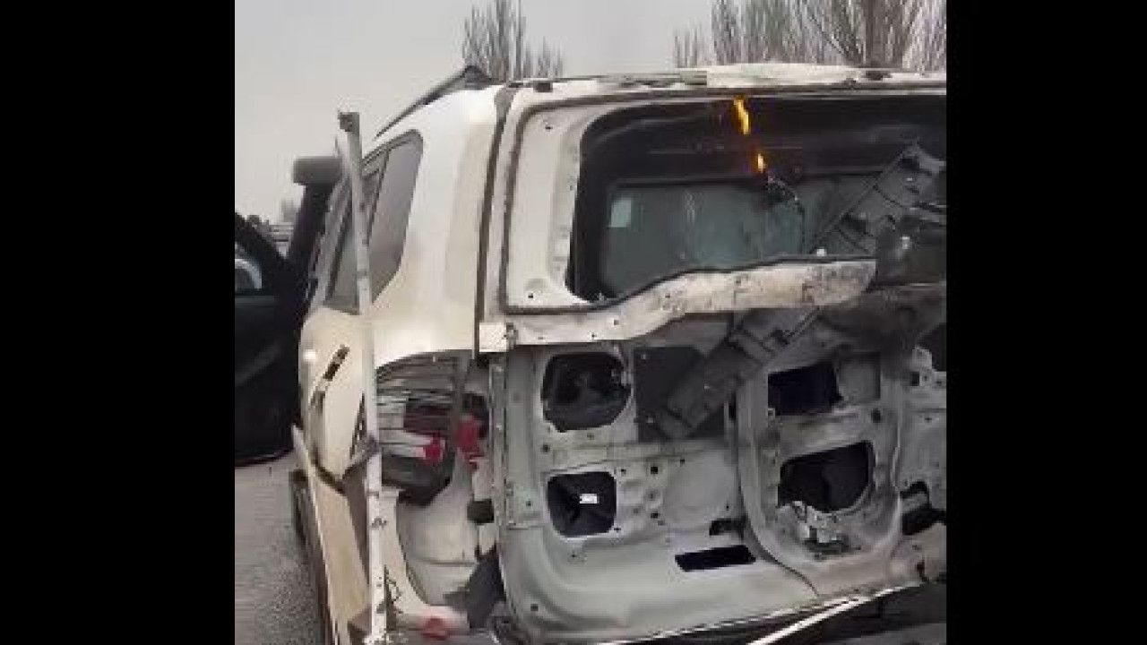 Φωτογραφία που συνοδεύει την ανάρτηση του Γκρόσι στην πλατφόρμα Χ δείχνει ένα κατεστραμμένο αυτοκίνητο με ευκρινή διακριτικά του ΔΟΑΕ.