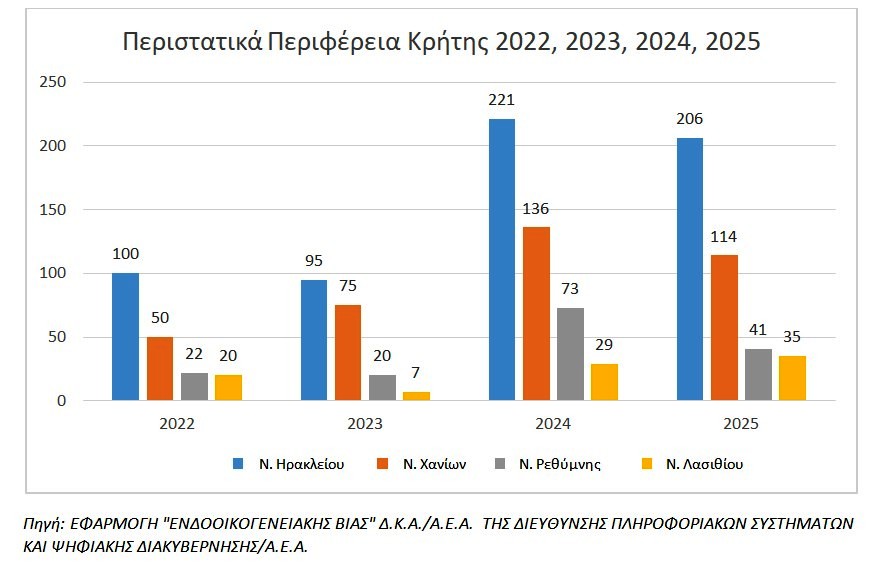 Τα παραπάνω δεδομένα εντάσσονται σε ένα ευρύτερο πλαίσιο αυξημένης ενδοοικογενειακής βίας σε όλη τη χώρα. Σύμφωνα με την ΕΛΑΣ, το διάστημα Ιανουάριος–Ιούνιος 2025 καταγράφηκαν 16.345 καταγγελίες περιστατικών ενδοοικογενειακής βίας, με το 78% των θυμάτων να είναι γυναίκες. Ο αριθμός αυτός είναι διπλάσιος σε σχέση με το αντίστοιχο διάστημα του 2023 (8.294 καταγγελίες). Αναλυτικότερα, η Αττική (ΓΑΔΑ) καταγράφει 4.434 περιστατικά, η Θεσσαλονίκη (ΓΑΔΘ) 927, ενώ η Κρήτη καταλαμβάνει την τέταρτη θέση πανελλαδικά, με 725 καταγγελίες.