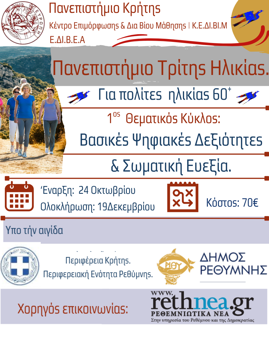 Το «Πανεπιστήμιο Τρίτης Ηλικίας» υλοποιείται για πρώτη φορά από το Κέντρο Δια Βίου Μάθησης του Πανεπιστημίου Κρήτης, το Παιδαγωγικό Τμήμα Δ.Ε και το Εργαστήριο Νέων Τεχνολογιών στη Δια Βίου και Εξ Αποστάσεως Εκπαίδευση [Ε.ΔΙ.Β.Ε.Α].