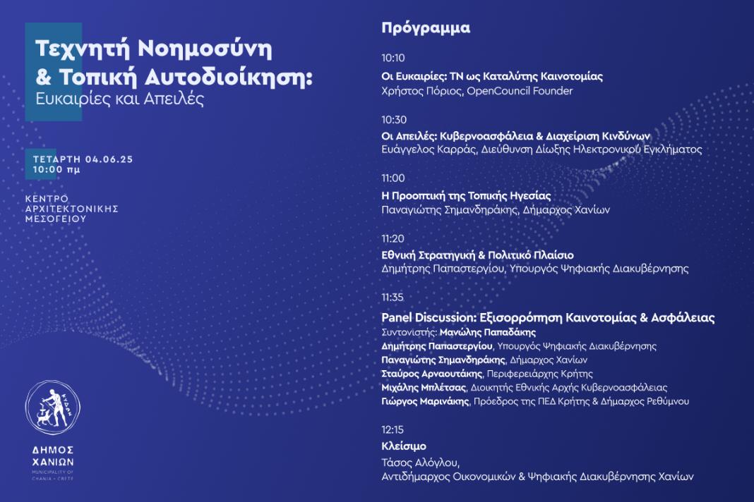 Ο Δήμος Χανίων έχοντας πρωταγωνιστικό ρόλο στον ψηφιακό μετασχηματισμό της τοπικής αυτοδιοίκησης και πιστός στη δέσμευσή του για καινοτομία, διαφάνεια και ασφάλεια, διοργανώνει ημερίδα με τίτλο «Τεχνητή Νοημοσύνη στην Τοπική Αυτοδιοίκηση: Ευκαιρίες και Απειλές», την Τετάρτη 4 Ιουνίου 2025, στις 10:00 π.μ., στο Κέντρο Αρχιτεκτονικής Μεσογείου.