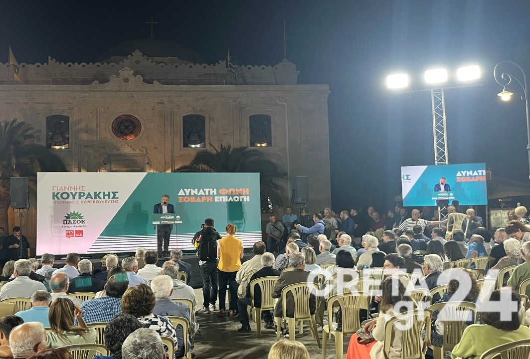 Με εντυπωσιακή προσέλευση πραγματοποιήθηκε το βράδυ της Πέμπτης η κεντρική προεκλογική ομιλία του υποψήφιου ευρωβουλευτή του ΠΑΣΟΚ, Γιάννη Κουράκη, στην πλατεία Αγίου Τίτου στο Ηράκλειο.