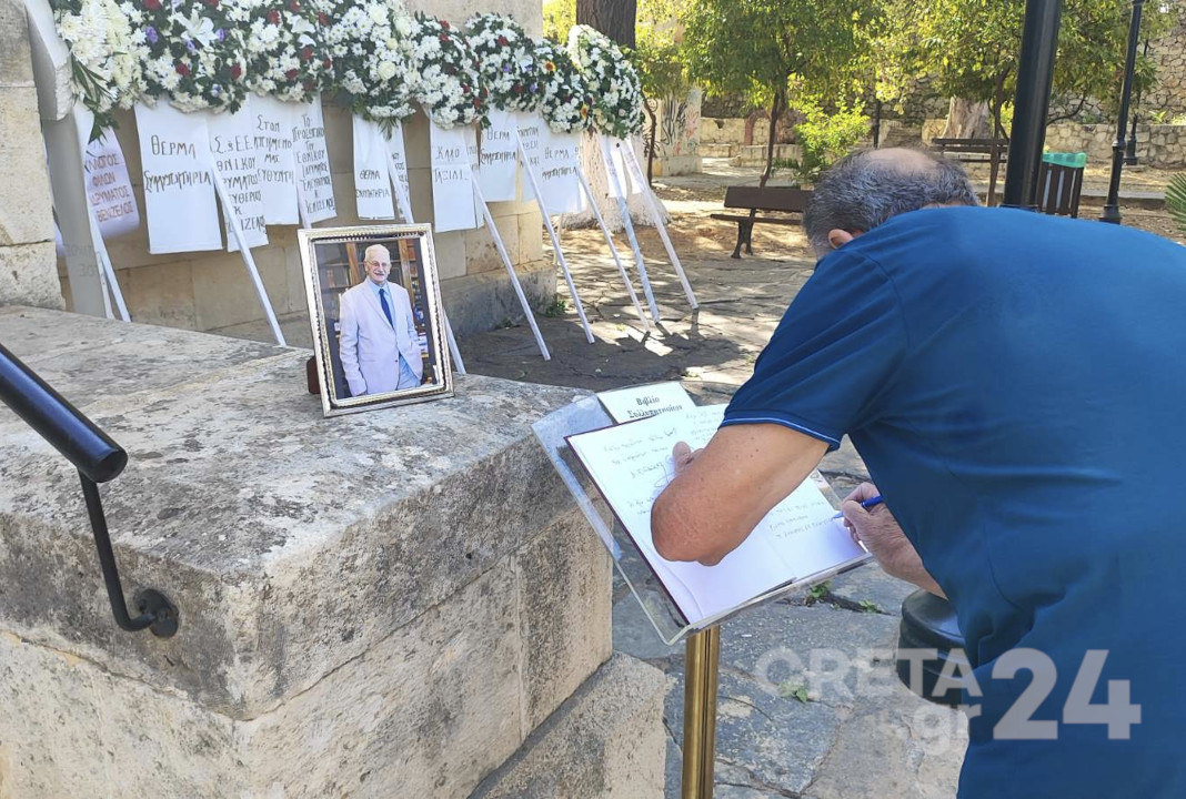 Στην εκκλησία της Αγίας Μαγδαληνής στη Χαλέπα πλήθος κόσμου καταφτάνει για το ύστατο χαίρε στον πρωτεργάτη της δημιουργίας του Ιδρύματος, που επί 25 χρόνια υπηρέτησε με μοναδικό πάθος και αφοσίωση ζωής τη διαφύλαξη της ιστορικής μνήμης και την ανάδειξη της πολιτικής κληρονομιάς και παρακαταθήκης του Βενιζέλου.